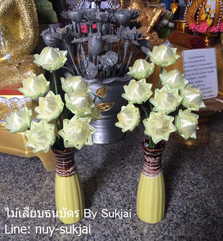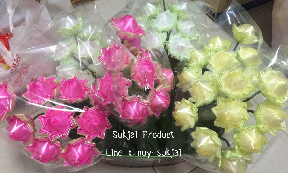 งานฝีมือจากริบบิ้น ช่อดอกบัวไหว้พระ ราคา ช่อละ 90 บาท (9 ดอก)