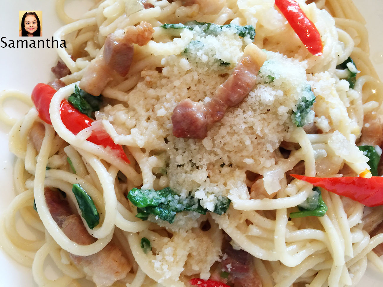 สปาเก็ตตี้ผัดพริกแห้งไส้กรอก+แฮม