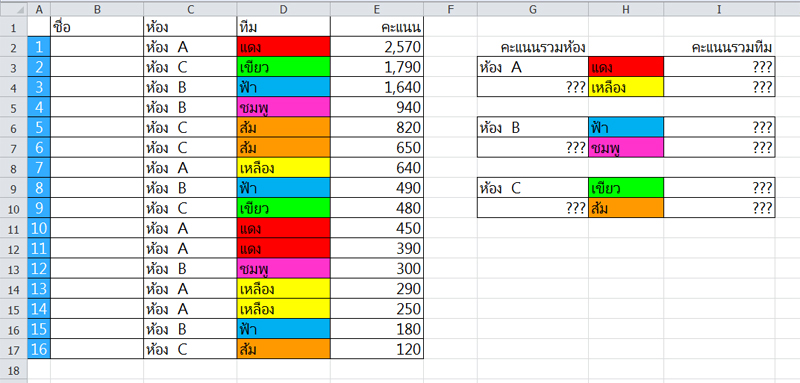 ต้องการรวมคะแนน โดยแยกตามห้อง มีสูตรอะไรใช้ได้บ้างคะ? (มีตัวอย่าง)