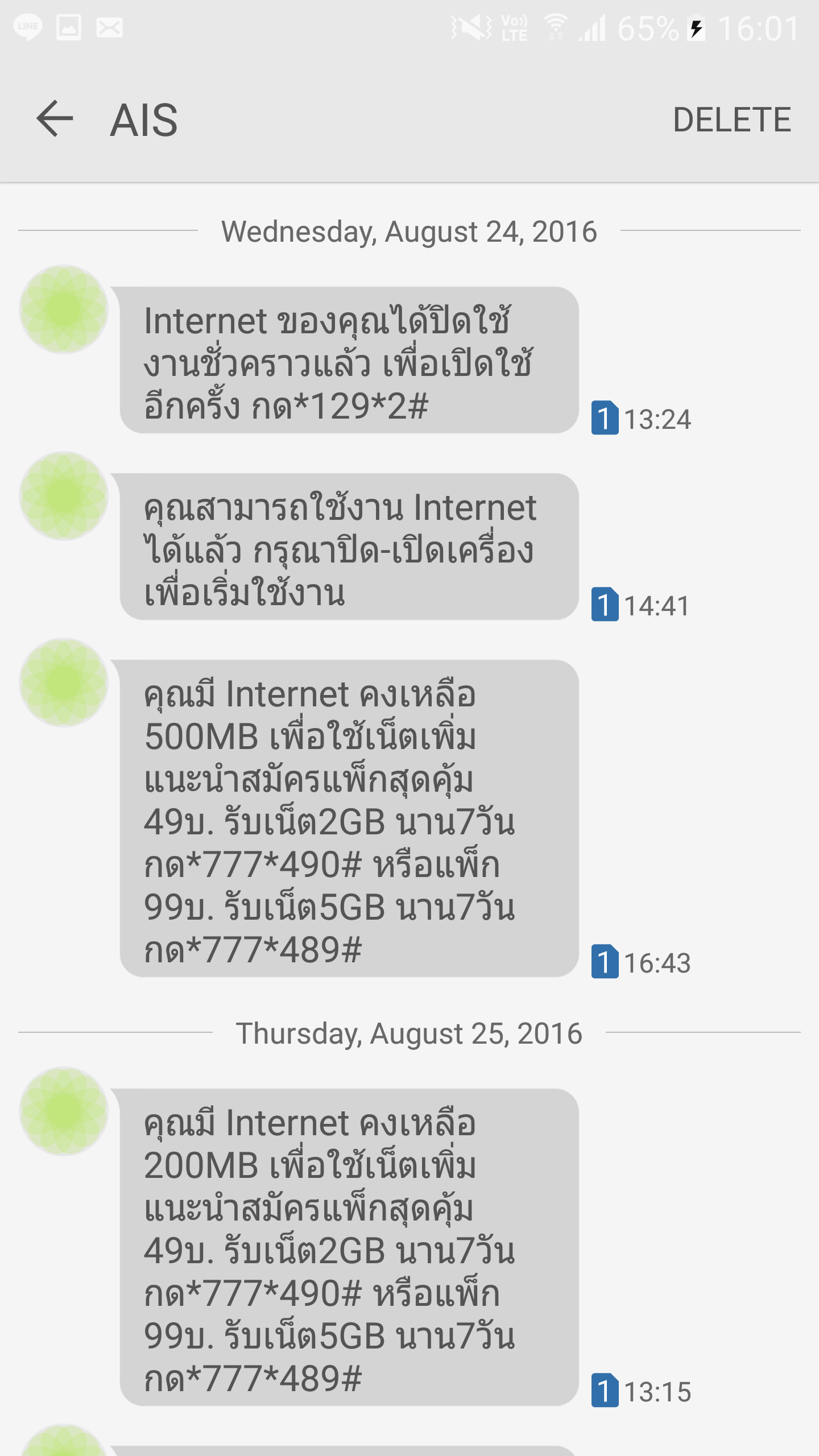 สวัสดีครับ ผมใช้ Samsung S7 และ Ais 4G advance internet 30GB/Month (cycle 1-31) พูดง่ายๆ ตัดรอบทุกสิ้นเดือน ปัญหามีอยู่ว่าผมจะ monitoring การใช้ data internet ผ่าน app AIS อยูเป็นประจำเพื่อยืดหยุ่นการใช้งานครับ ปรากฏว่าวันที่ 25/08/2016 AIS ส่ง sms มาว่าเน็มเหลือ 500MB ตามภาพ ซึ่งผมจำได้ว่าเช็คล่าสุดยังเหลือ 10GB ประมาณ วันสองวันก่อน(ไม่ได้แคหน้าจอไว้แต่ชัวร์)