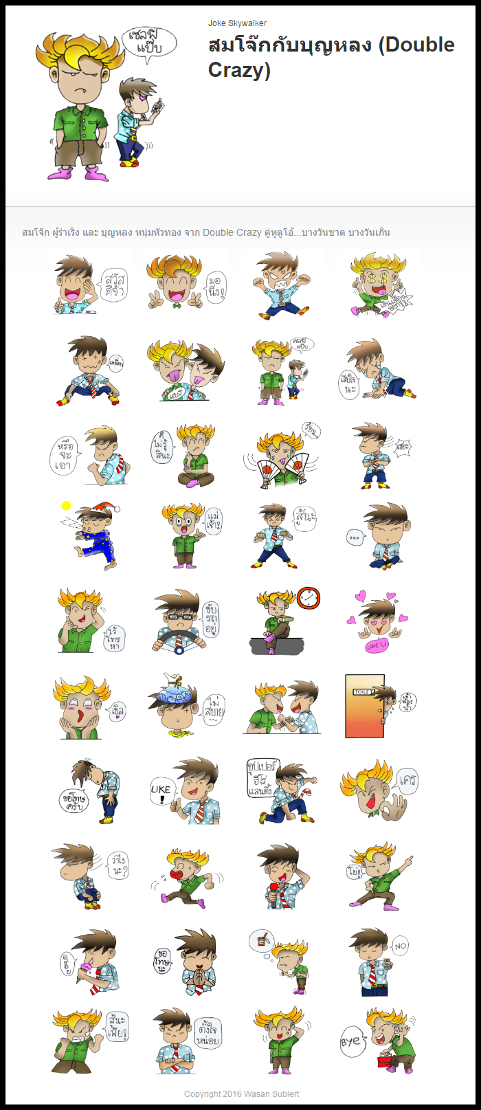 ชุดนี้ได้ไอเดียคืออยากให้เป็นคู่หูดูโอ้กวนๆ เพราะคิดว่าถ้ามีคาแรคเตอร์แต่ตัวเดียวคนที่เห็นอาจจะไม่อยากได้ แต่หากมี 2 ตัวมันคุ้มกว่า (555) ส่วนที่มาของชื่อก็มาจากคนใกล้ๆตัวนี่แหละครับ เจ้าของชื่อบอกว่าถ้าขายดีขอค่าลิขสิทธิ์ด้วย แหะๆ...จริงๆถ้าขายดีก็ว่าจะแบ่งให้นะเนี่ย ^^ แต่ยอดการโหลดช่างต่ำเตี้ยเรี่ยดินเสียนี่กระไร สติ๊กเกอร์ชุดนี้แก้ไขไป 2 รอบ กว่าจะอนุมัติ เบ็ดเสร็จใช้เวลารอไปประมาณ 1 เดือนถึงจะได้เริ่มจำหน่าย หลังจากที่วางจำหน่ายไปแล้วได้ระยะนึง ผมก็วาดการ์ตูนเป็นเรื่องราวของสองตัวนี้ออกมา ลงให้อ่านใน Line Webtoon ชื่อเรื่อง Double Crazy บางวันขาด...บางวันเกิน