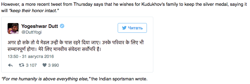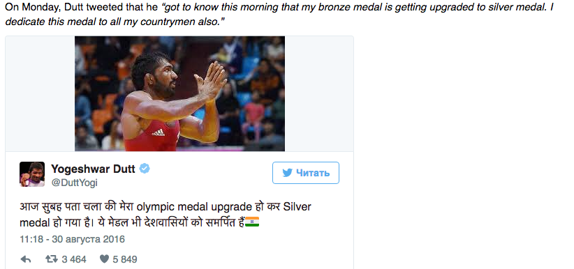 นักมวยปล้ำชาวรัสเซียได้รับเหรียญเงิน ส่วน Dutt ได้รับเหรียญทองแดง