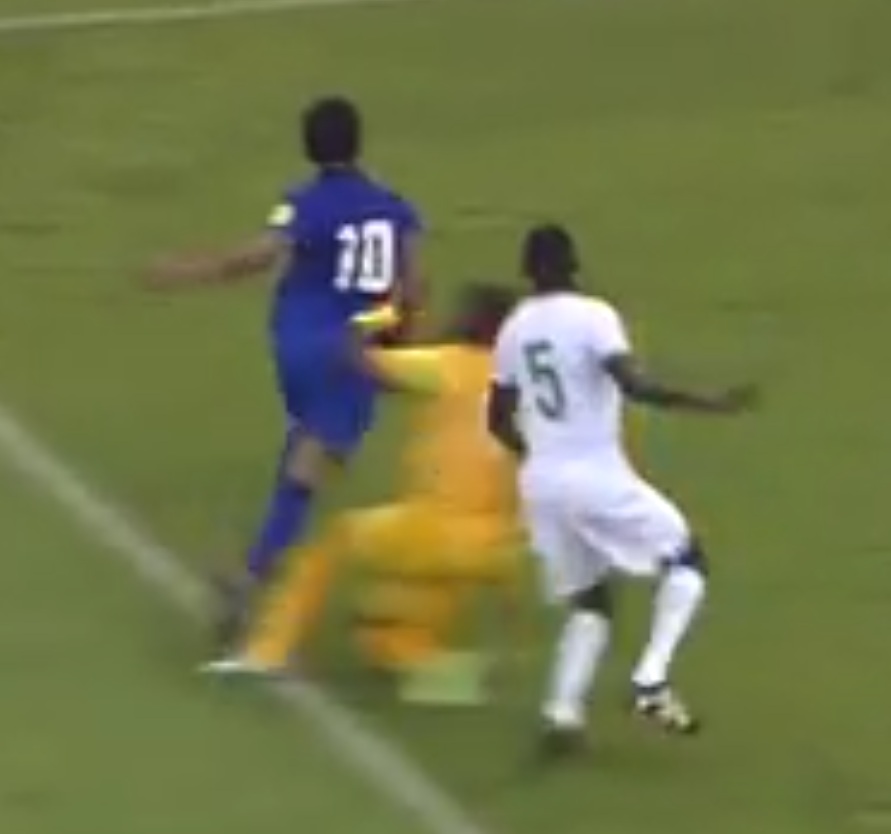 จังหวะมุ้ยโดนชาร์ช มาจากการโดนโกลซาอุ ใช้มือสองข้างขวางไว้ ไม่เกี่ยวกับเท้าเลย มุมนี้จะเป็นมุมที่ชัดสุดเท่าที่จะเห็นแล้ว ว่ามือโกลโดนตัว (ต้องดูภาพเคลื่อนไหวประกอบ แล้วจะรู้สึกได้ถึงการขัดจังหวะกันชัดเจนครับ)