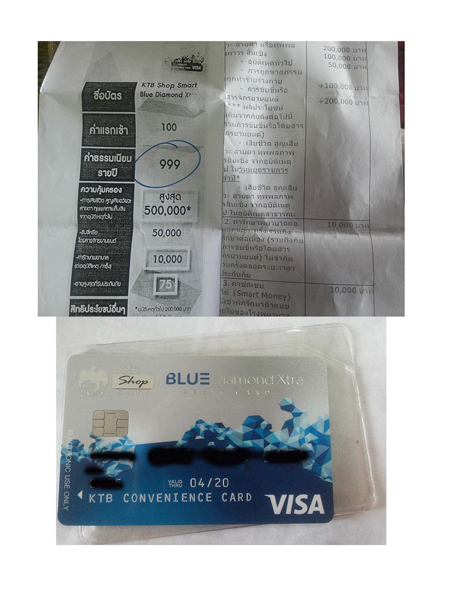 เมื่อเช้าบังเอิญแกวานให้ผมไปกดเงินเอาเงินเบี้ยคนแก่ จากการสอบถามที่ปกติแกจะวานคนรอบข้างไปกดมาให้เจียดออกมาใช้จ่ายบางครั้งบางคราว พอผมไปกด ตู้ธนาคารก็แจ้งว่า "หน้าจอแสดงบัตรไม่สมบูรณ์ โปรดติดต่อธนาคาร" ก็คิดว่าตู้เสีย ผมจึงเอาบัตร KTB ของผมลองกดก็ใช้ได้ปกติ เลยกลับบ้านมาสอบถามแก ปกเล่าว่าเงินในบัญชีต้องมีติดอยู่ประมาณ 900+ เพราะแกไม่ได้ไปกดเอาเงินมาใช้ 1 เดือน ผมเลยนึกสาเหตุมาไปที่บัตรของแกเห็นเป็นบัตร Blue Diamond EXTRA ก็ตกใจครับ ว่าทำไมแกไปเปิดบัตรใบนี้มา ได้คุยไปก็รู้ถึงสาเหตุเดิมๆ ที่เราๆรู้กันคือ แกทำตามพนักงานธนาคารบอก แกยังเล่าว่าตอนที่ไปเปิดบัญชีแกกำเงินไป 1000 กว่าบาท กะว่าจะเอาเงินก้อนแรกฝากตอดบัญชีไว้สัก 800.- แต่ก็ถูกพนักงานหักเป็นค่าเปิดบัตรไปจนหมด (ระหว่างแกเล่าผมรุ้สึกอารมณ์ขึ้นแทนแกจริงๆ) และลุงแกก็เดินไปหยิบใบปลิวที่ได้มาจากธนาคารวันนั้นให้ผมดู (ตามภาพ)