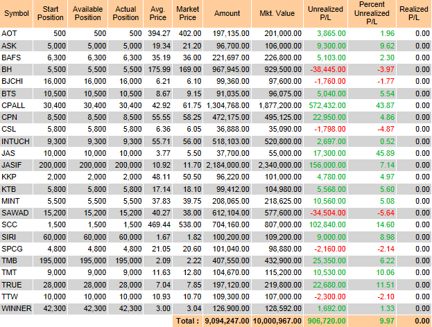 พอร์ทนี้เริ่มลงทุนช่วงกลางเดือน ต.ค. ปีที่แล้วดัชนีประมาณ 1440 ก่อนตลาดเทกระจาดพอดี เริ่มต้นประมาณ 2 ล้าน และลงทุนเพิ่มเรื่อยมาจนมาจบที่ 3.5 ล้านประมาณปลายปี หลังจากนั้นได้เงินมาลงทุนเพิ่มอีกครั้งกลางเดือน มิ.ย. ปีนี้ 5.3 ล้าน โดยได้เงินปันผลมาแล้วประมาณ 170000 และได้กำไรจากการซื้อขาย ประมาณ 60000 พอได้มาก็ซื้อหุ้นเพิ่มทันที ปันผลเฉลี่ยของพอร์ทนี้ประมาณ 4%