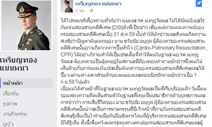 ผู้อำนวยการโรงพยาบาลมงกุฎวัฒนะ โพสต์เฟซบุ๊ก ชี้อาจมีเจ้าหน้าที่รู้เห็นการตายของ "ธวัชชัย" ยืนยัน ไม่มีความขัดแย้งกับทางดีเอสไอ