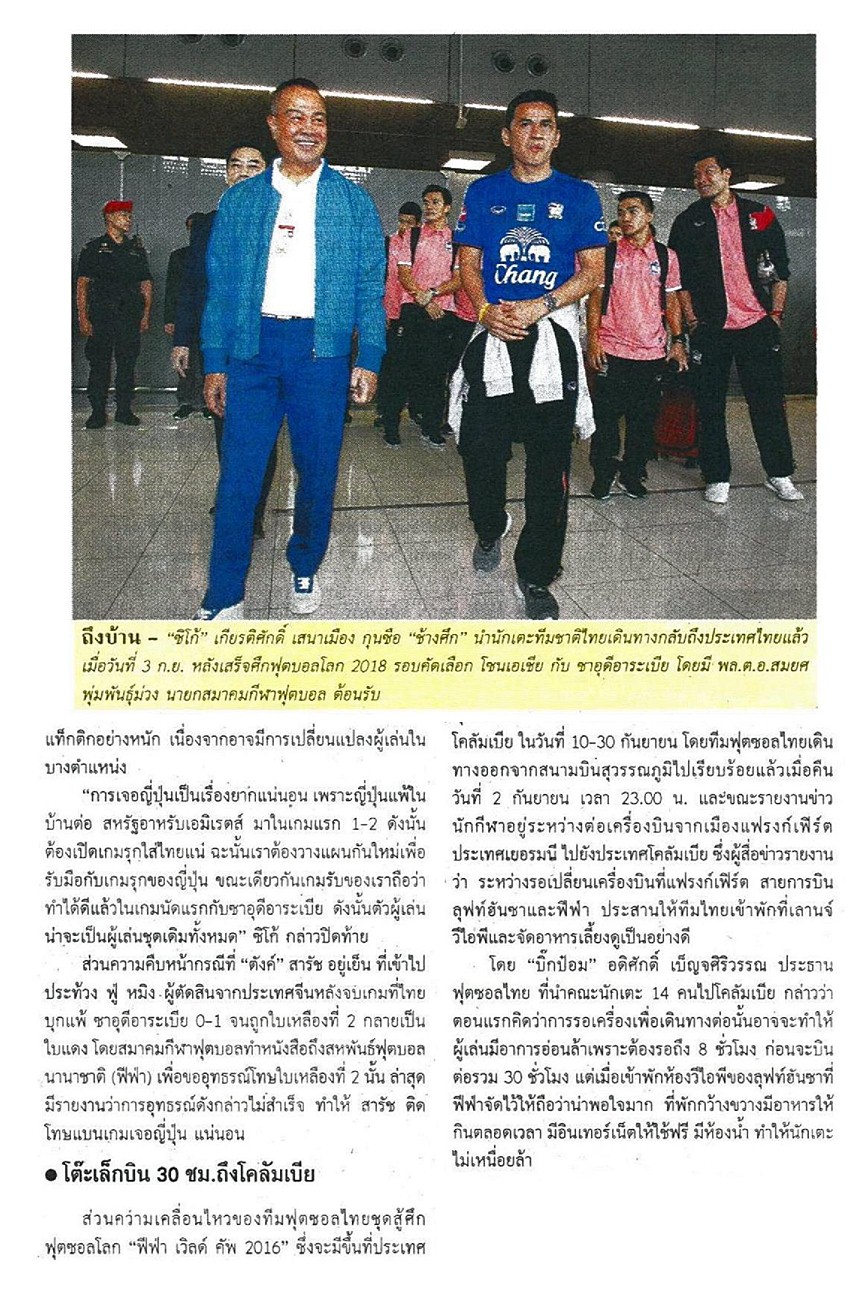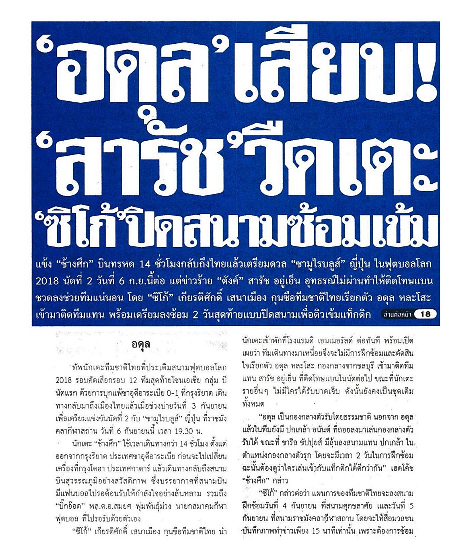 จากมติชนออนไลน์ ความเคลื่อนไหวของ "ช้างศึก" ทีมชาติไทย ชุดใหญ่ ที่เตรียมทำศึกฟุตบอลโลก 2018 รอบคัดเลือก โซนเอเชีย กลุ่มเอฟ นัด 3 พบ อิรัก วันที่ 8 กันยายน แต่ก่อนหน้านั้นวันที่ 3 กันยายน ไท