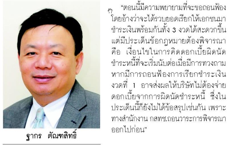 "ตอนนี้มีความพยายามที่จะขอถอนฟ้องโดยอ้างว่าจะได้รวบยอดเรียกให้เอกชนมาชำระเงินพร้อมกันทั้ง 3 งวดได้สะดวกขึ้น แต่มีประเด็นข้อกฎหมายต้องพิจารณา คือ เงื่อนไขในการคิดดอกเบี้ยผิดนัดชำระหนี้ที่จะเริ่มนับต่อเมื่อมีการทวงถาม หากมีการถอนฟ้องการเรียกชำระเงิน งวดที่ 1 อาจส่งผลให้บริษัทไม่ต้องจ่าย ดอกเบี้ยจากการผิดนัดชำระหนี้ ซึ่งในประเด็นนี้ก็ยังไม่ได้ข้อสรุปเช่นกัน เพราะทางสำนักงาน กสทช.ถอนวาระการพิจารณาออกไปก่อน"