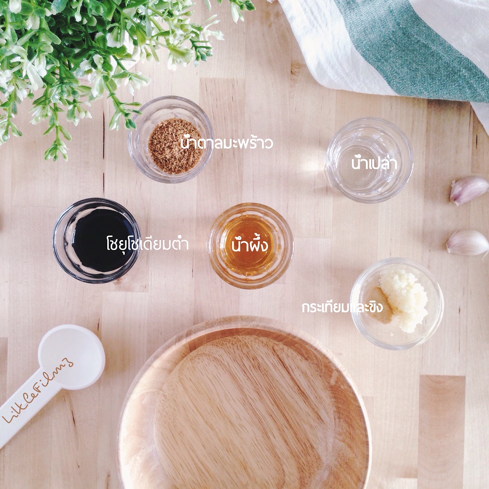 เริ่มจากส่วนผสมของซอสเทอริยากิกันก่อนนะคะ เราจะใส่ทุกอย่างที่มีได้แก่ น้ำตาล น้ำเปล่า น้ำผึ้ง โชยุ กระเทียมและขิง ผสมรวมและคนให้เข้ากันเลยยย