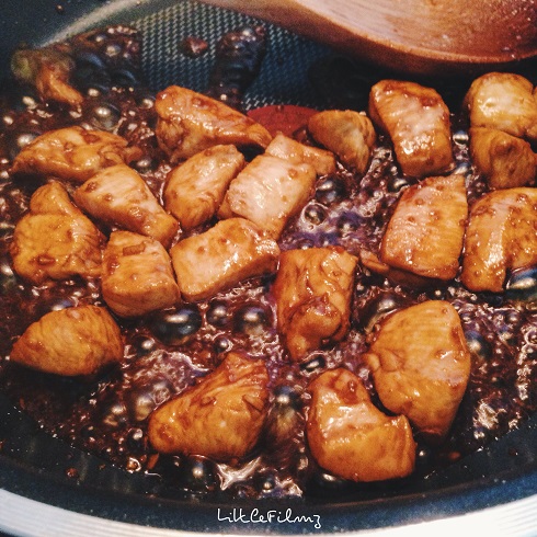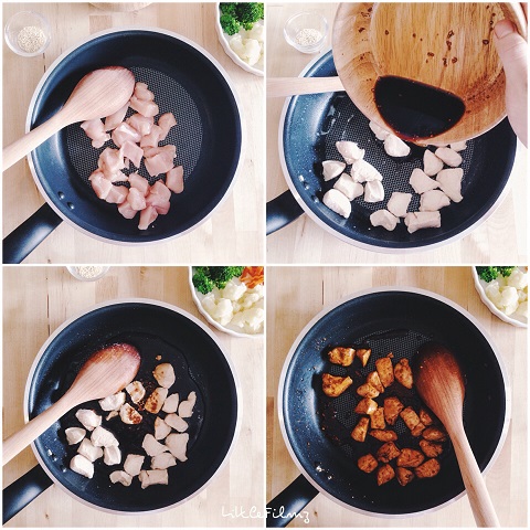 โดยเริ่มจากใช้กระทะเทฟล่อน ตั้งไฟให้ร้อน ฟิล์มไม่ใช้น้ำมันแล้วนะคะเพราะว่าเนื้อไก่มีน้ำมันงาเคลือบแล้ว พอกระทะร้อนได้ที่ใส่เนื้อไก่ลงไปเลยค่ะ ผัดสักแบบให้เริ่มเปลี่ยนเป็นสีขาวนิดๆแต่ไม่สุกหมดนะคะเดี่ยวเนื้อจะเหนียว ก็ตามด้วยซอสที่เราผสมไว้เทลงไปเลย และเคี่ยวต่อไปให้ซอสงวดลงและเนื้อไก่สุกดี