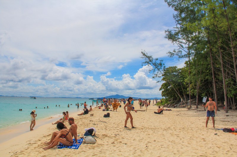 วันนี้ผมไปทัวร์เกาะพีพีครับ หลังจากลงเรือ ไกด์จะนำเราไปที่ เกาะแบมบู (Bamboo Beach) เป็นเกาะที่แบ่งเชื้อชาติได้ชัดเจนที่สุด 555 ทำไมถึงเป็นแบบนั้น เพราะว่าที่นี้จะเต็มไปชาวจีนและชาวตะวันตก ขณะที่ชาวจีนจะเล่นน้ำกันอย่างสนุกสนานเหมือนกับไม่เคยเล่นน้ำมาก่อน 555555 ส่วนชาวตะวันตกหัวดำหัวทองก็จะนอนอาบแดด เป็นแถวยาวเลยครับ เราใช้เวลาอยู่ที่นี้ประมาณ 45 นาที