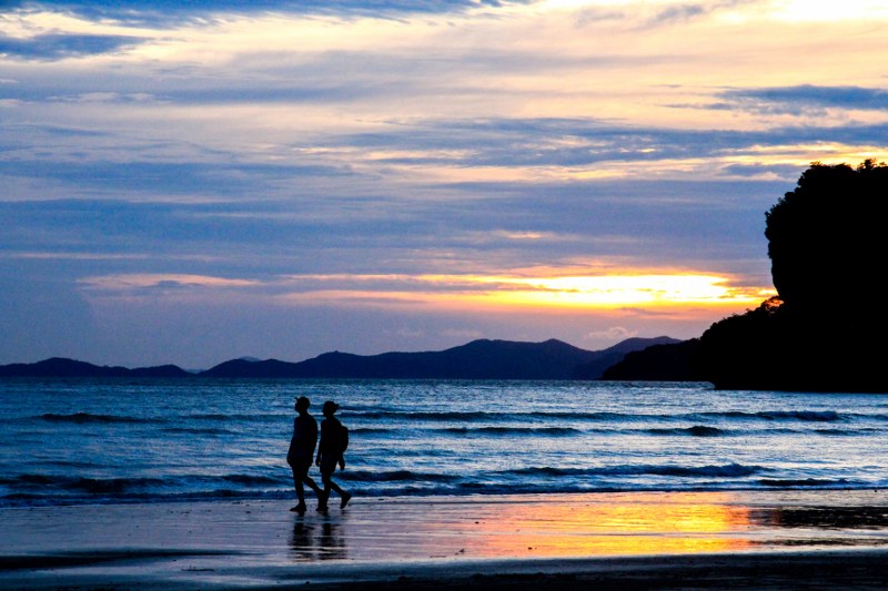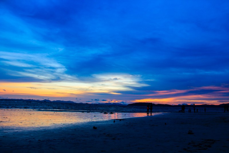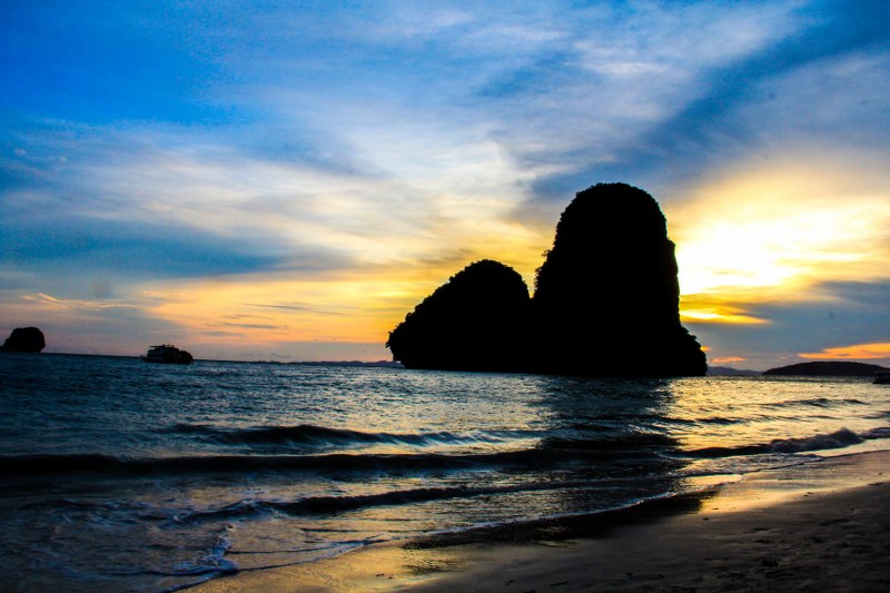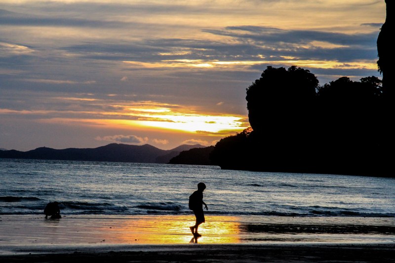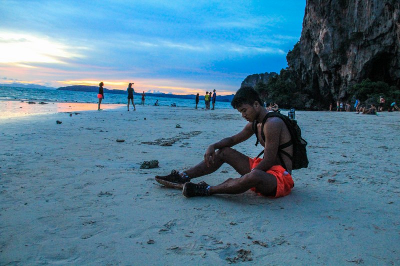 หลังจากลงเขาผมก็มานั่งดูพระอาทิตย์ตกที่หาดถ้ำพระนาง หาดนี้จะเป็นหาดที่สวยที่สุดของไร่เลย์ และเป็นหาดที่นักท่องเที่ยวชอบมาเล่นน้ำกันครับ