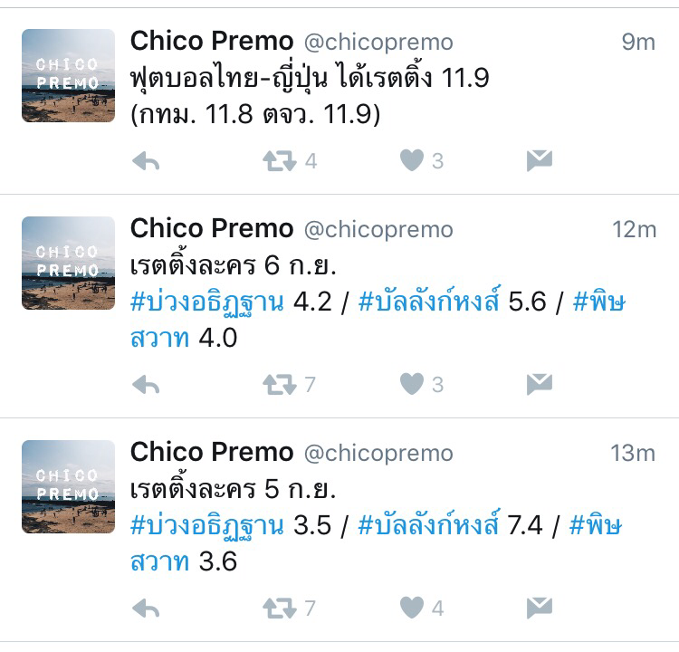 ขอบคุณข้อมูลจากทวิตเตอร์คุณ Chico Premo ด้วยครับ ป.ล. คุณ Chico Premo ไม่ได้รายงานเรตติ้งละครวันที่ 19 ก.ย. 59 เพราะข้อมูลของช่อง 3 (บ่วงอธิฏฐาน) กับช่อง one (พิษสวาท-ตอนจบ) ไม่ตรงกับที่มีการแชร์กันค