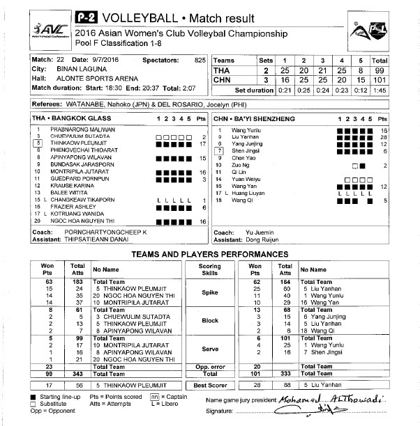 รายงานผล วอลเล่ย์บอลหญิง ชิงแชมป์สโมสรเอเชีย ประจำวันที่ 6 กันยายน 2559