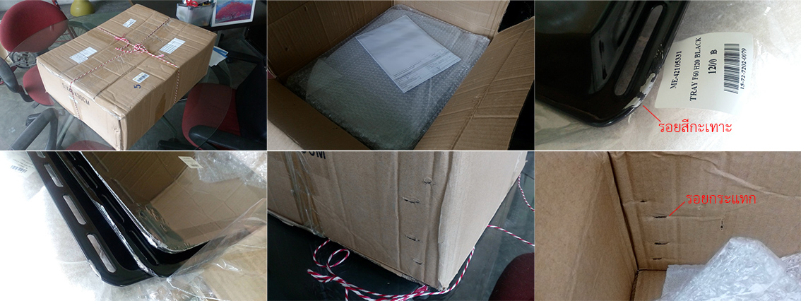 วันนี้ได้รับกล่องพัสดุ เห็นสภาพภายนอกก็โล่งใจ ไม่บุบบู้บี้ แกะออกมาสินค้าก็ห่อบับเบิ้ลรอบตะแกรง 1 ชิ้นและถาด 3 ชิ้นแยกเป็นชิ้นๆไป ก็ดูดี แต่พอแกะบับเบิ้ลออกปรากฏว่ามีการกระแทกที่มุมถาดจนสีเคลือบกระเทาะทั้ง 3 ใบ เห็นแล้วเสียดายของครับ คือมันก็ใช้งานได้อยู่ แต่มันก็กลายเป็นของมีตำหนิไป