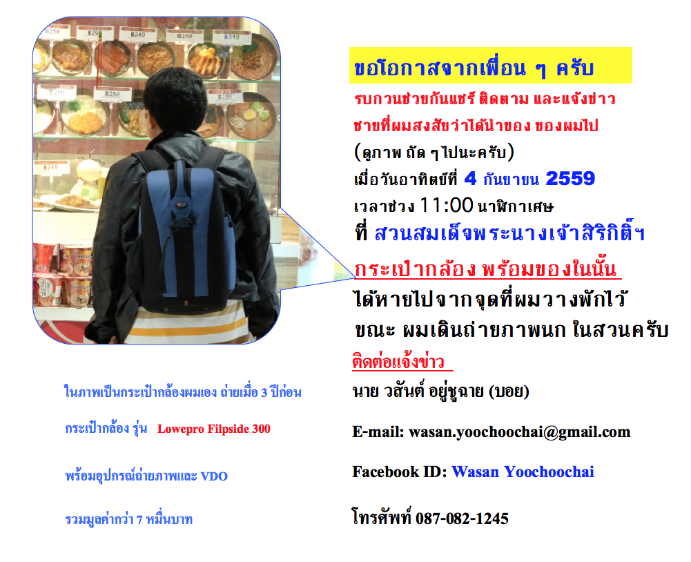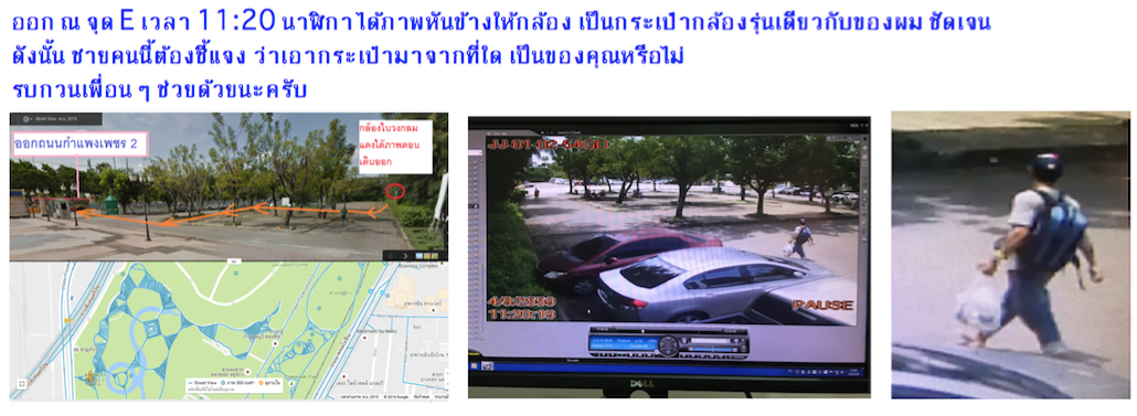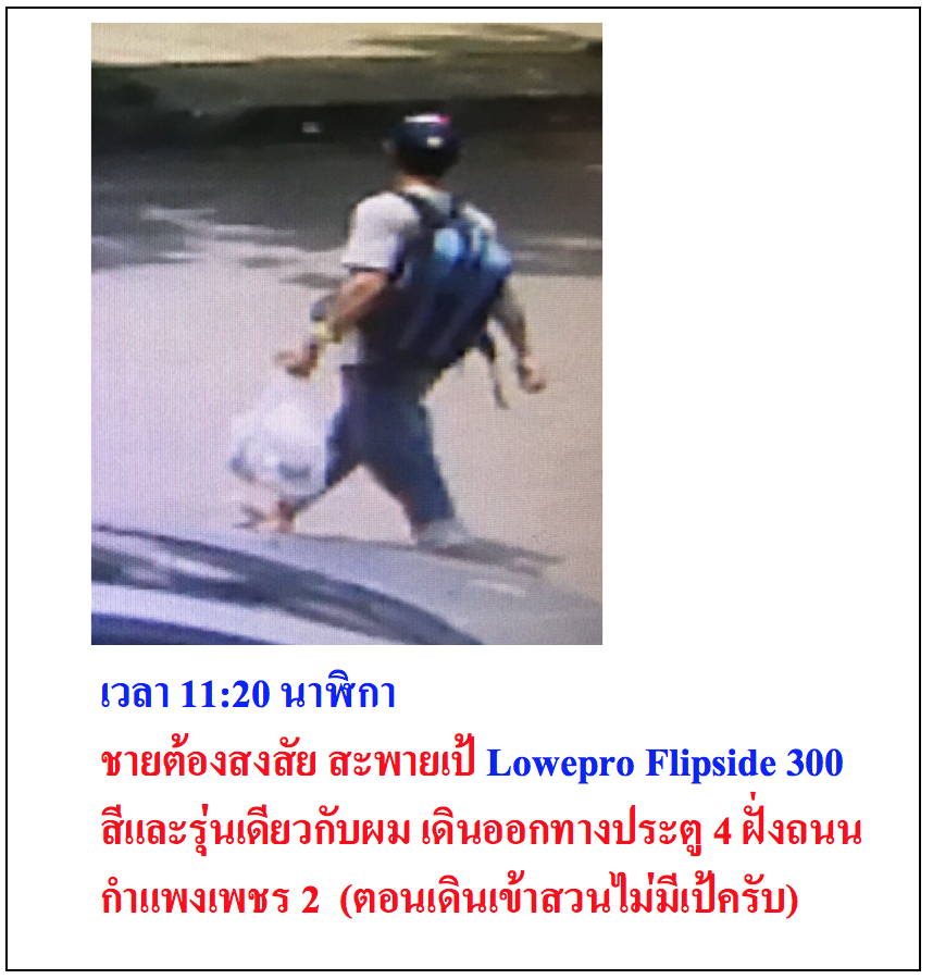 เมื่อดูภาพชุดนี้จบแล้ว ถ้าพอจะสะดวก รบกวนช่วยแชร์ ไปให้ถึงชายในภาพหรือ ให้ข้อมูลที่เพื่อน ๆ ได้เห็นนี้ สื่อสารไปยังคนรู้จัก หรือพบเห็น ผู้ชายในภาพที่กล้อง CCTV จับไว้ได้ขณะที่สะพายกระเป๋ากล้อง รุ่นเดียวกับผม ในวัน เวลา สถานที่ เดียวกันกับที่ผมถูกคนหยิบเอาไป เนื่องจากมีภาพที่น่าสงสัย เรียงลำดับเหตุได้ดังนี้