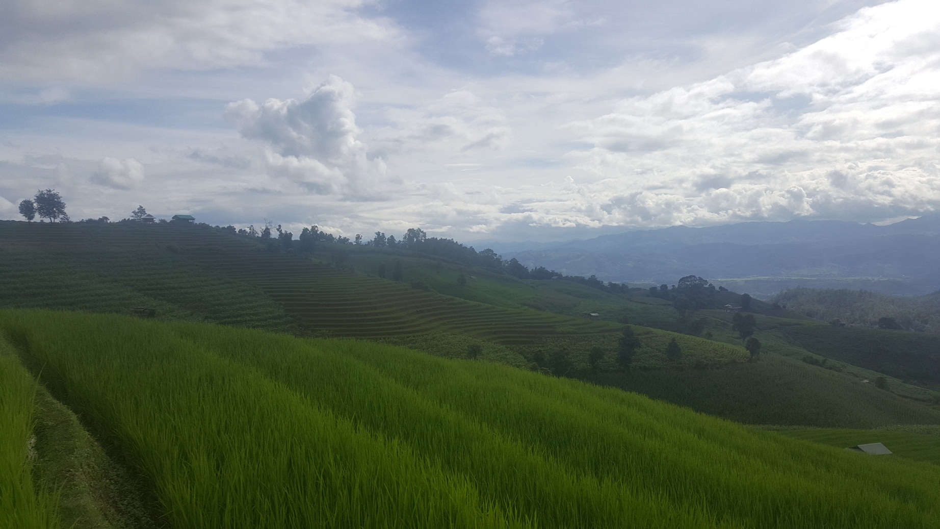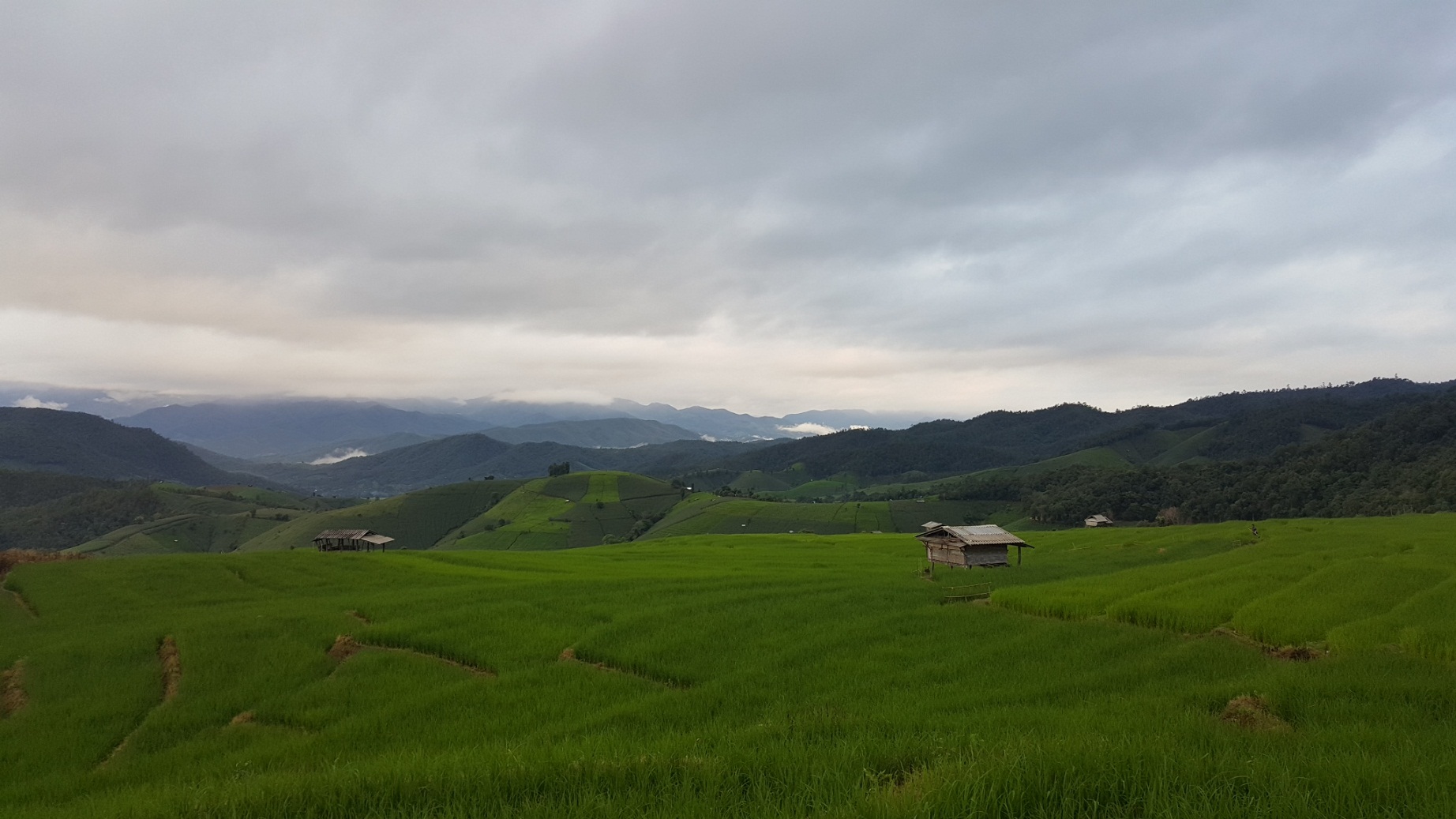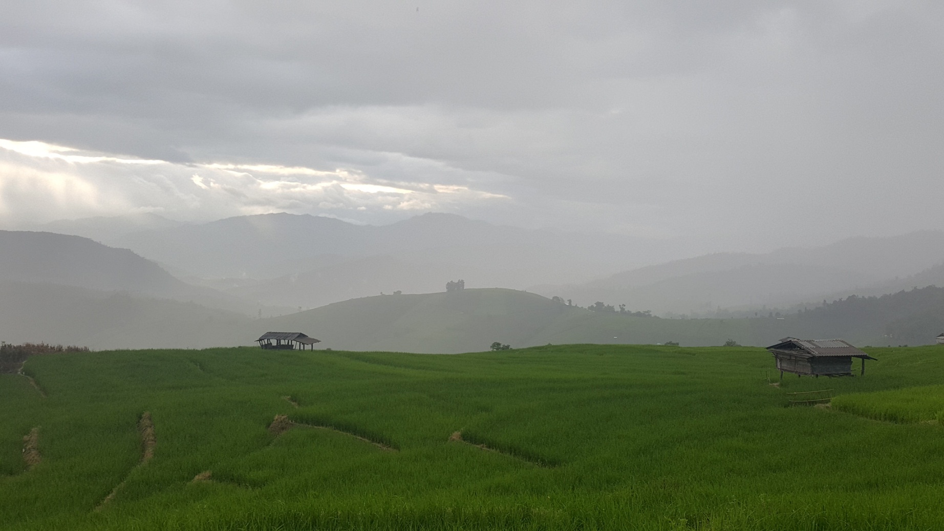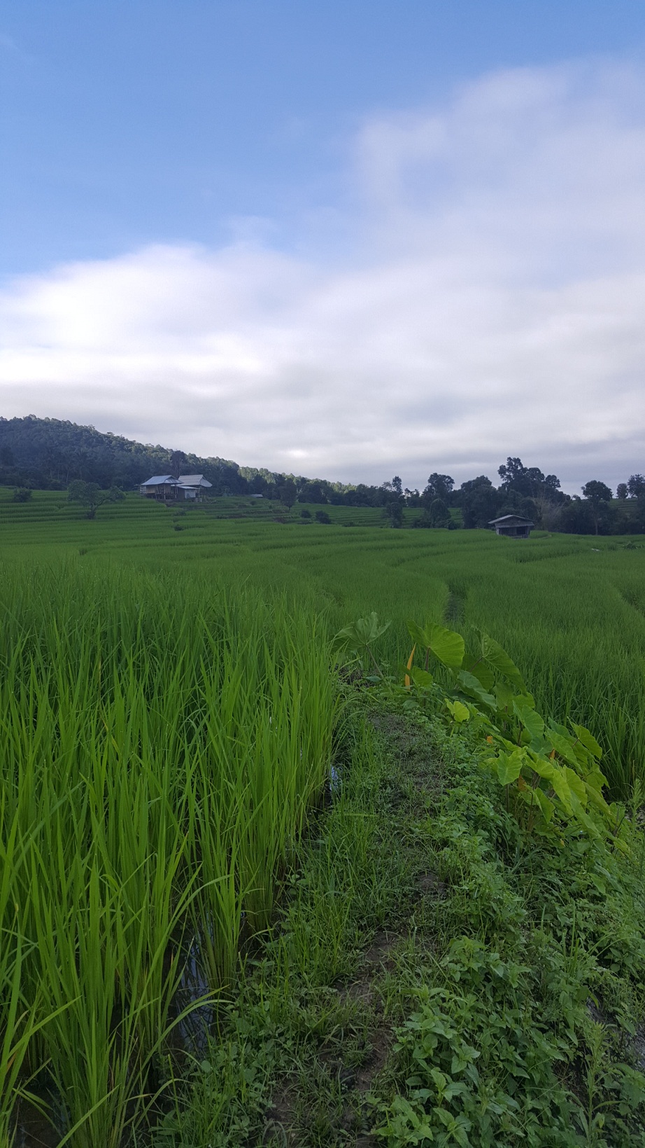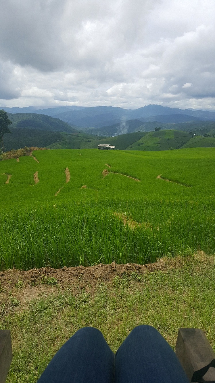 พอเห็นวิวแล้วไม่อยากเชื่อว่าที่นี่มีจริง เคยเห็นแต่ในรูป พอเห็นด้วยตาแล้วสวยกว่าในรูปเยอะเลยค่ะ เรามาถึงกันประมาณเกือบๆบ่ายสอง มาถึงก็เดินเข้าที่พัก บ้านที่เราพักชื่อบ้านกลางนา เดินแบกของลงคันนามาถึงที่พัก วางของกันสเปะสะปะ แล้วรีบถ่ายรูปกันเลยค่ะ ถ่ายรูปกันซักพัก ก็หยิบไก่ทอดข้าวเหนียวมากินกันที่ระเบียงบ้าน กินไป ดูวิวนาขั้นบันไดไป เป็นอาหารมื้อแรกที่ได้กินพร้อมวิวที่สวยขนาดนี้ กินเสร็จเรากับเพื่อนก็นั่งโง่ๆ ดูวิวนากัน ที่เรียกว่านั่งโง่ๆ คือไม่ทำอะไรกันเลยค่ะ นั่งแล้วไม่ต้องคิดอะไร ดูนาไปเรื่อยๆ บวกกับไปนาฤดูฝนอากาศจะเปลี่ยนตลอด เดี๋ยวเมฆมาหมอกมา แดดมา นั่งโง่ๆ กันไปประมาณสามชั่วโมงได้ค่ะ
