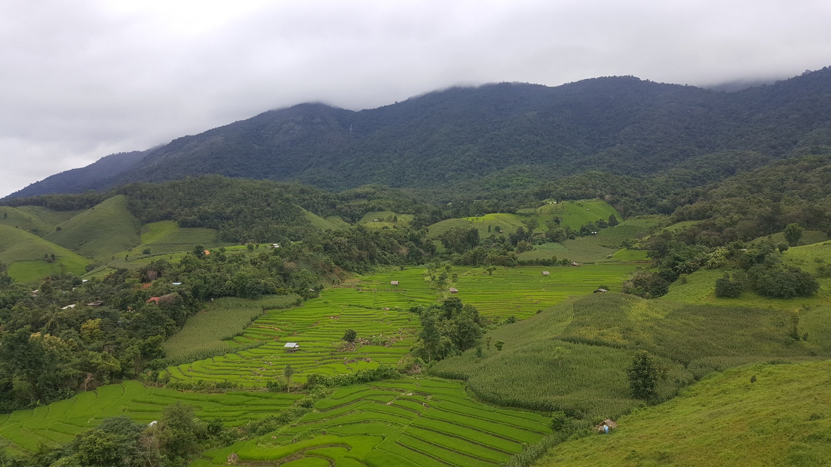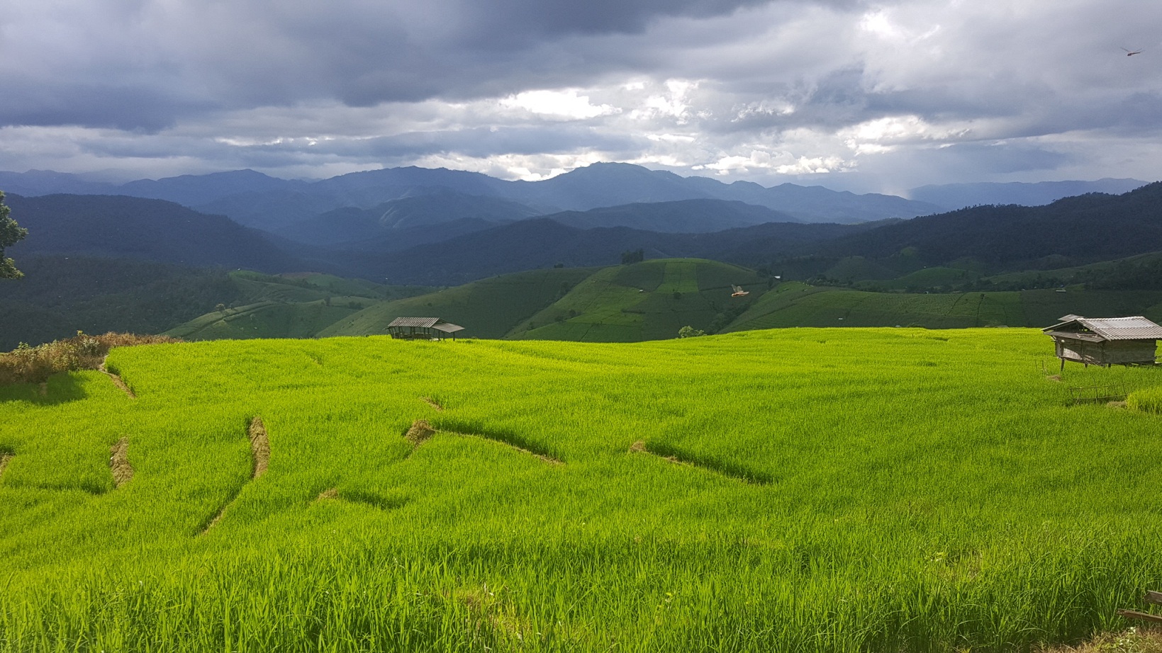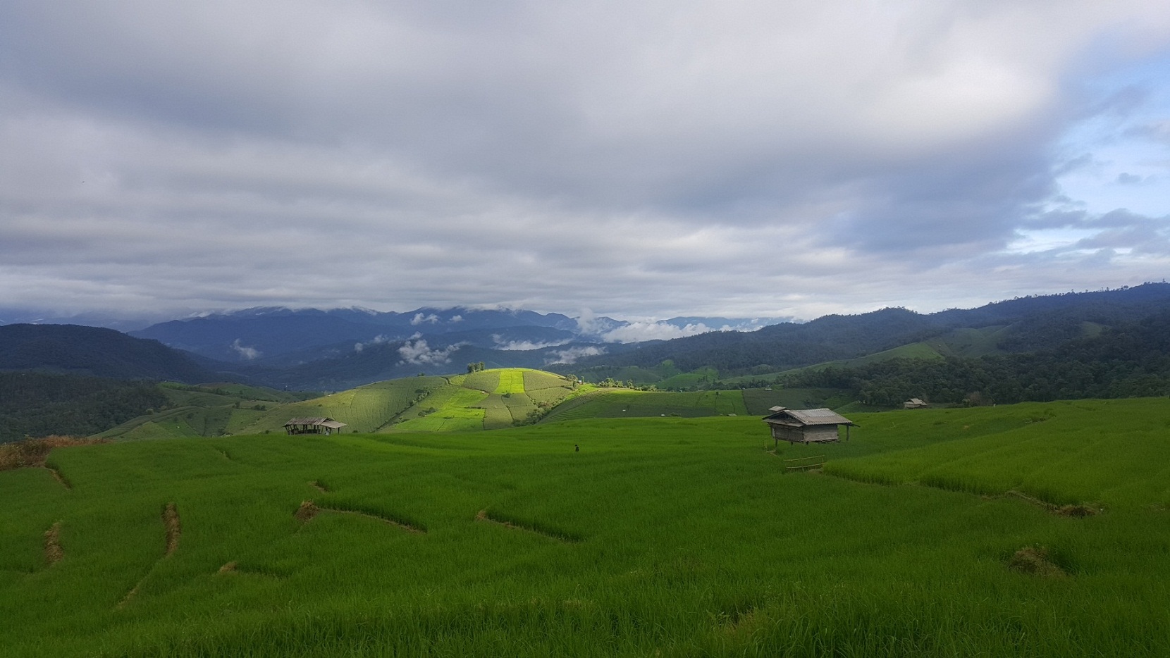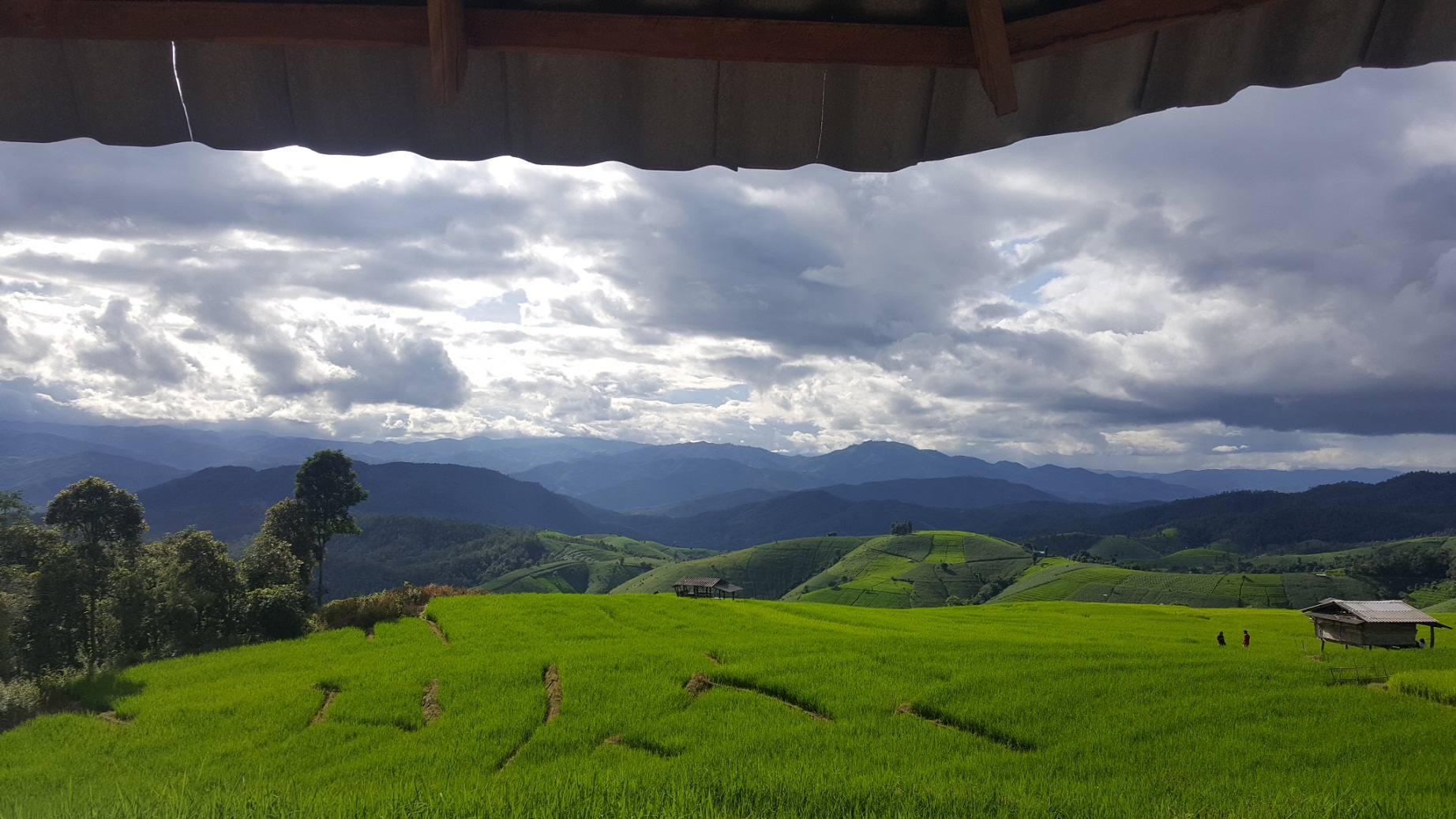พอเห็นวิวแล้วไม่อยากเชื่อว่าที่นี่มีจริง เคยเห็นแต่ในรูป พอเห็นด้วยตาแล้วสวยกว่าในรูปเยอะเลยค่ะ เรามาถึงกันประมาณเกือบๆบ่ายสอง มาถึงก็เดินเข้าที่พัก บ้านที่เราพักชื่อบ้านกลางนา เดินแบกของลงคันนามาถึงที่พัก วางของกันสเปะสะปะ แล้วรีบถ่ายรูปกันเลยค่ะ ถ่ายรูปกันซักพัก ก็หยิบไก่ทอดข้าวเหนียวมากินกันที่ระเบียงบ้าน กินไป ดูวิวนาขั้นบันไดไป เป็นอาหารมื้อแรกที่ได้กินพร้อมวิวที่สวยขนาดนี้ กินเสร็จเรากับเพื่อนก็นั่งโง่ๆ ดูวิวนากัน ที่เรียกว่านั่งโง่ๆ คือไม่ทำอะไรกันเลยค่ะ นั่งแล้วไม่ต้องคิดอะไร ดูนาไปเรื่อยๆ บวกกับไปนาฤดูฝนอากาศจะเปลี่ยนตลอด เดี๋ยวเมฆมาหมอกมา แดดมา นั่งโง่ๆ กันไปประมาณสามชั่วโมงได้ค่ะ