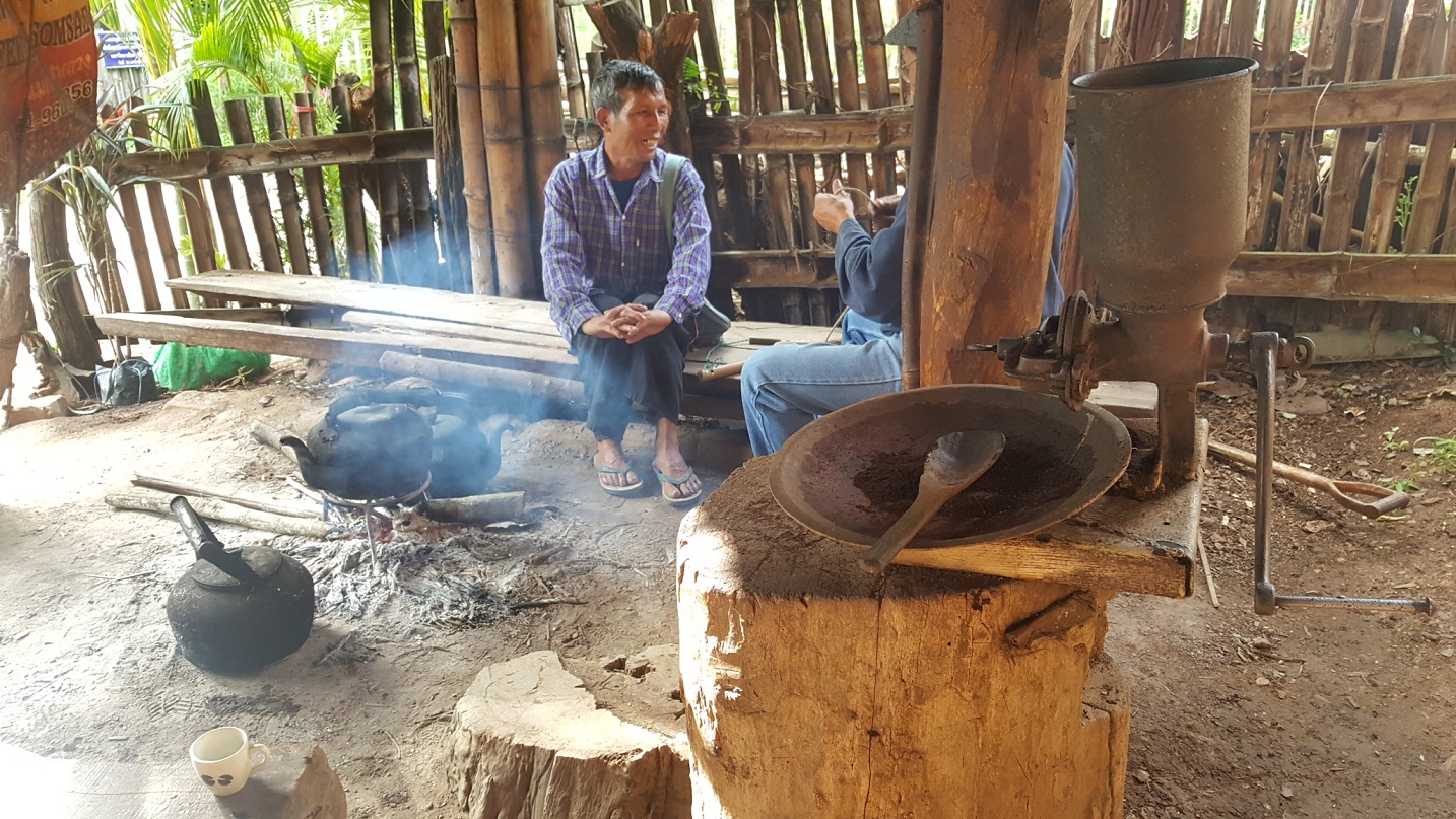หลังจากนั้นผู้ใหญ่บ้านก็พาพวกเราไปฝากกับพี่สมศักดิ์ ชาวปกากะญอ ที่บ้านแม่กลางหลวง พี่สมศักดิ์ต้อนรับพวกเราด้วยกาแฟและแสดงมายากลให้ดู เอาจริงๆ เราเห็นพี่แกแสดงมายากลตลอดอ่ะค่ะ พอมีแขกใหม่มาก็แสดง แกน่ารักดีนะคะ ใต้ถุนบ้านแกไม่เคยเงียบเลยค่าา มีสีสันตลอด ตอนเย็นไม่มีไรทำ ชาวบ้านถามว่าจะกินข้าวที่นี่(ที่พักโฮมสเตย์) หรือไปกินกับชาวบ้าน ดูวัฒนธรรมชาวปกากะญอ พวกเราตัดสินใจไหนๆก็มาแล้ว ไปให้สุดค่ะ งั้นไปกับชาวบ้านละกัน พี่ไกด์ที่พาเที่ยว (ชาวปกากะญอ) พาไปดูต้นกาแฟต้นแรกของดอยอินทนนท์ พาไปจิบเหล้าที่ทำมาจากยอดข้าว รสชาติจะออกหวานๆ เหมือนดื่มน้ำมะพร้าว ดื่มแล้วร้อนคอเลยค่ะ แต่ไม่เมานะคะ และปิดท้ายด้วยกินกับข้าวกับชาวบ้านค่ะ