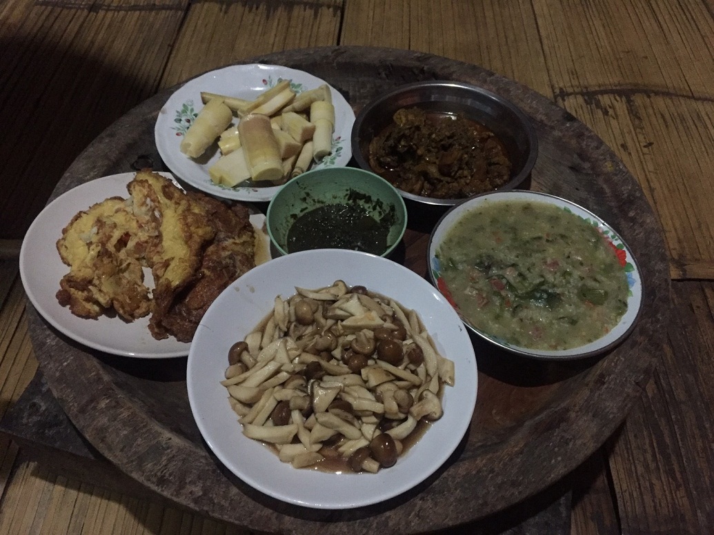 อันนี้กับข้าวค่ะ จะมีอาหารพื้นเมืองของชาวปกากะญอ คือน้ำพริกปู๋ กับข้าวเบอะ