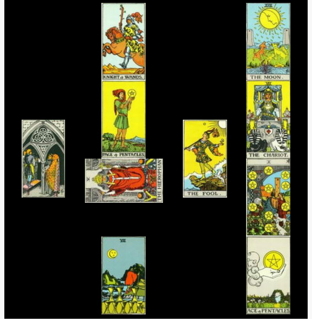 ตำแหน่งที่ 1 ไพ่ The nine of wands ตำแหน่งที่ 2 ไพ่ The six of swords ตำแหน่งที่ 3 ไพ่ The seven of wands ตำแหน่งที่ 4 ไพ่ The devil ตำแหน่งที่ 5 ไพ่ Strength ตำแหน่งที่ 6 ไพ่ The seven of cups ตำแหน่