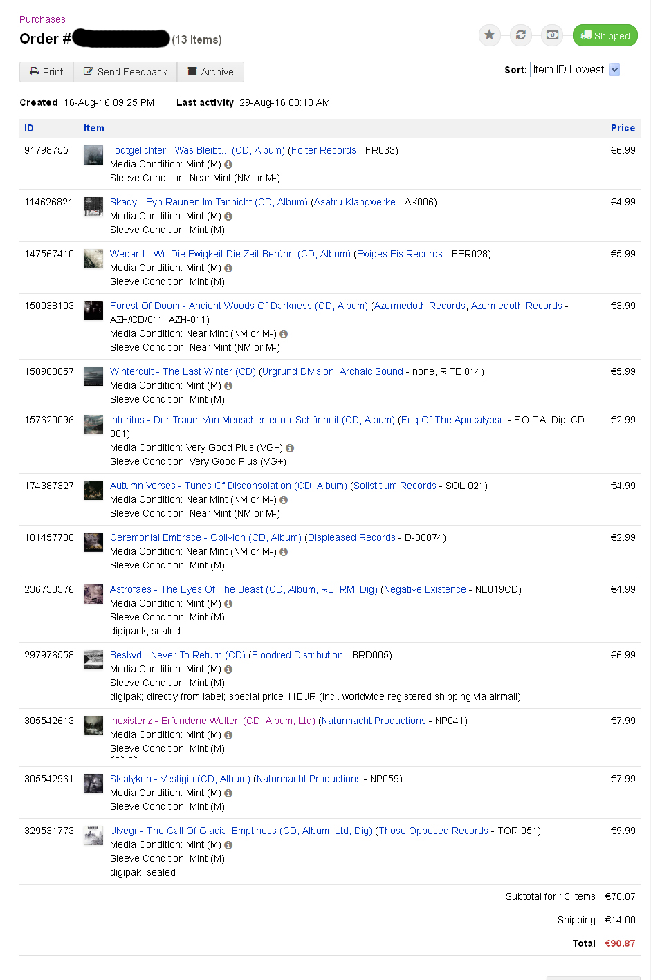 ก่อนอื่น ผมขออารัมภบทกล่าวเท้าความสักเล็กน้อย เรื่องเกิดหลังจากที่เงินค่าตัดต่อวีดิทัศน์อันเป็นรายได้เสริมของกระผมออก หลังจากรอคอยมาเนิ่นนาน ผมจึงไม่รอช้า กดสั่งซื้อซีดีใน Discogs ก่อนเลย (หลังจากอดมานานหลายเดือน) ผลที่ได้คือ 13 แผ่นดังรูป รวมค่าส่งแล้วตก 90 ยูโร คิดเป็นเงินไทยก็สามพันปลาย ๆ