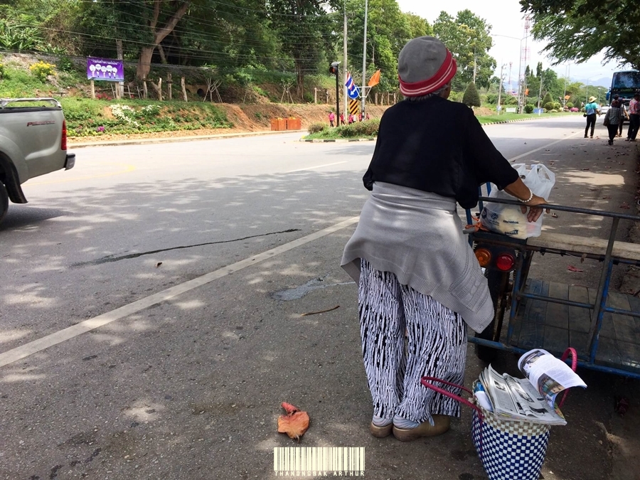 จุดที่ผมยืนผมเองก็ไม่มั่นใจหรอกครับว่ารถจะผ่านรึเปล่า รถจะหมดรึยัง มาครั้งแรกเนอะ จนมาเจอยายคนนึง รอรถอยู่ อยู่ๆ ยายเปิดมาก่อน “ไปไหนเหรอ?” “ไปสังขละเหรอ?” “ไปทำไรสังขละ?” “มาคนเดียวเหรอ?”