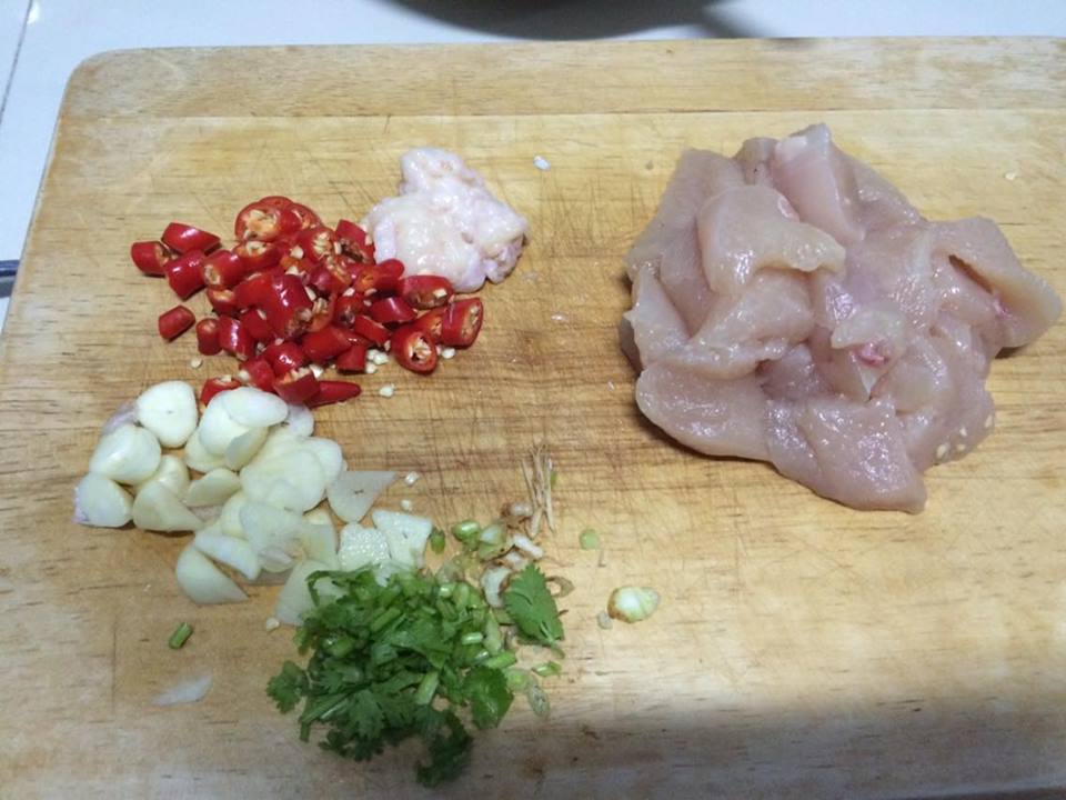 กองวัตถุดิบไว้ก่อน ตอนจะใช้จะได้สะดวก มีพริก กระเทียม ผักชี น้ำมัน คนอร์ พริกไทย กับอกไก่