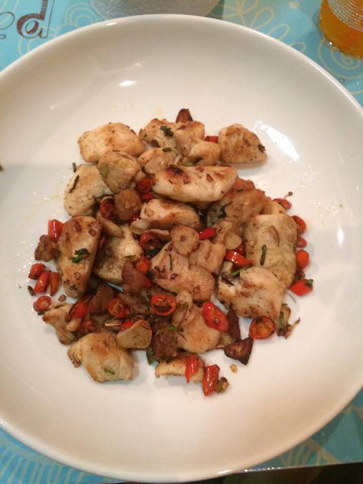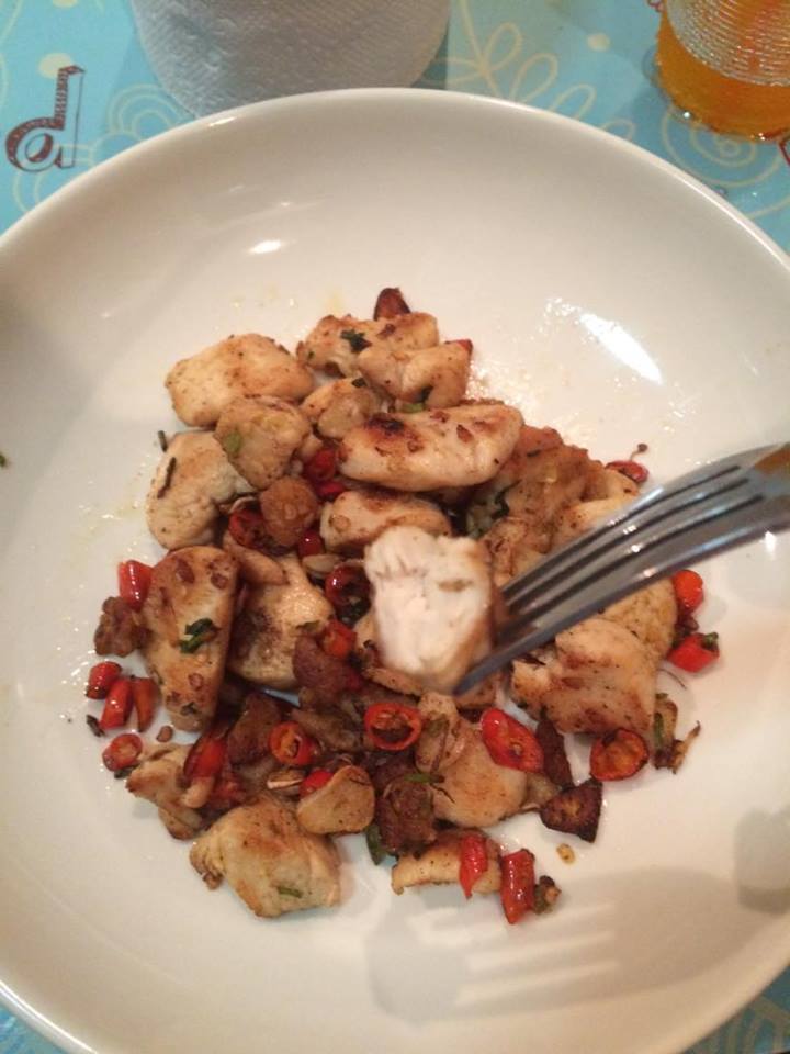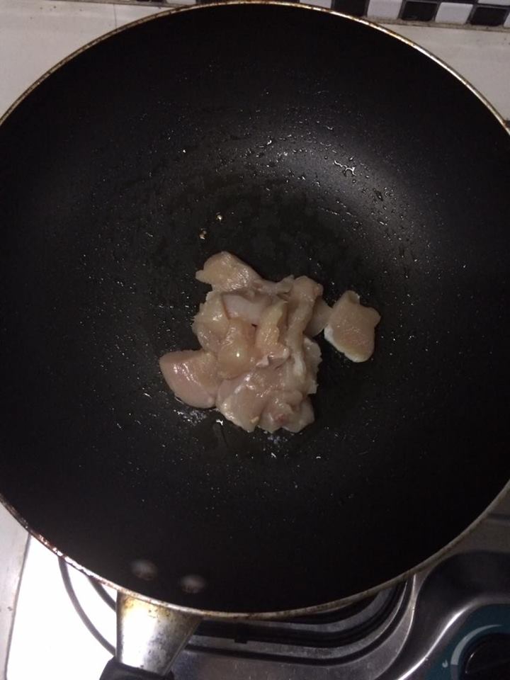 ออกมาอย่างที่เห็น ตอนหั่นๆอยู่ก็คิดได้ว่าแยกหนังไก่ออกไว้ก่อนดีกว่า เผื่อจะไม่ต้องใช้น้ำมัน(เพิ่งคิดได้)