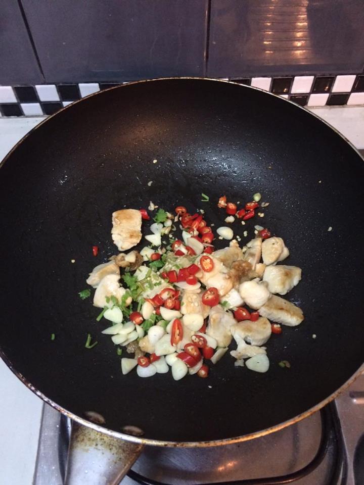 เจียวไปซักพักก็มีน้ำมันออกมา แล้วค่อยเอาไก่ลงมาคั่ว