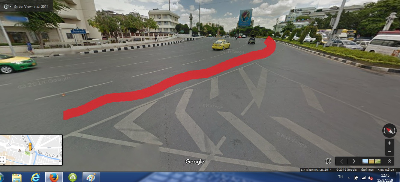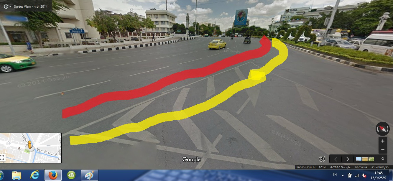 ผมอยู่ในช่องจราจรที่ 3 จากขวา (จากเกาะกลาง) ทิศทางการวิ่งมันควรจะมาตามเส้นแดงถูกมั๊ยครับ