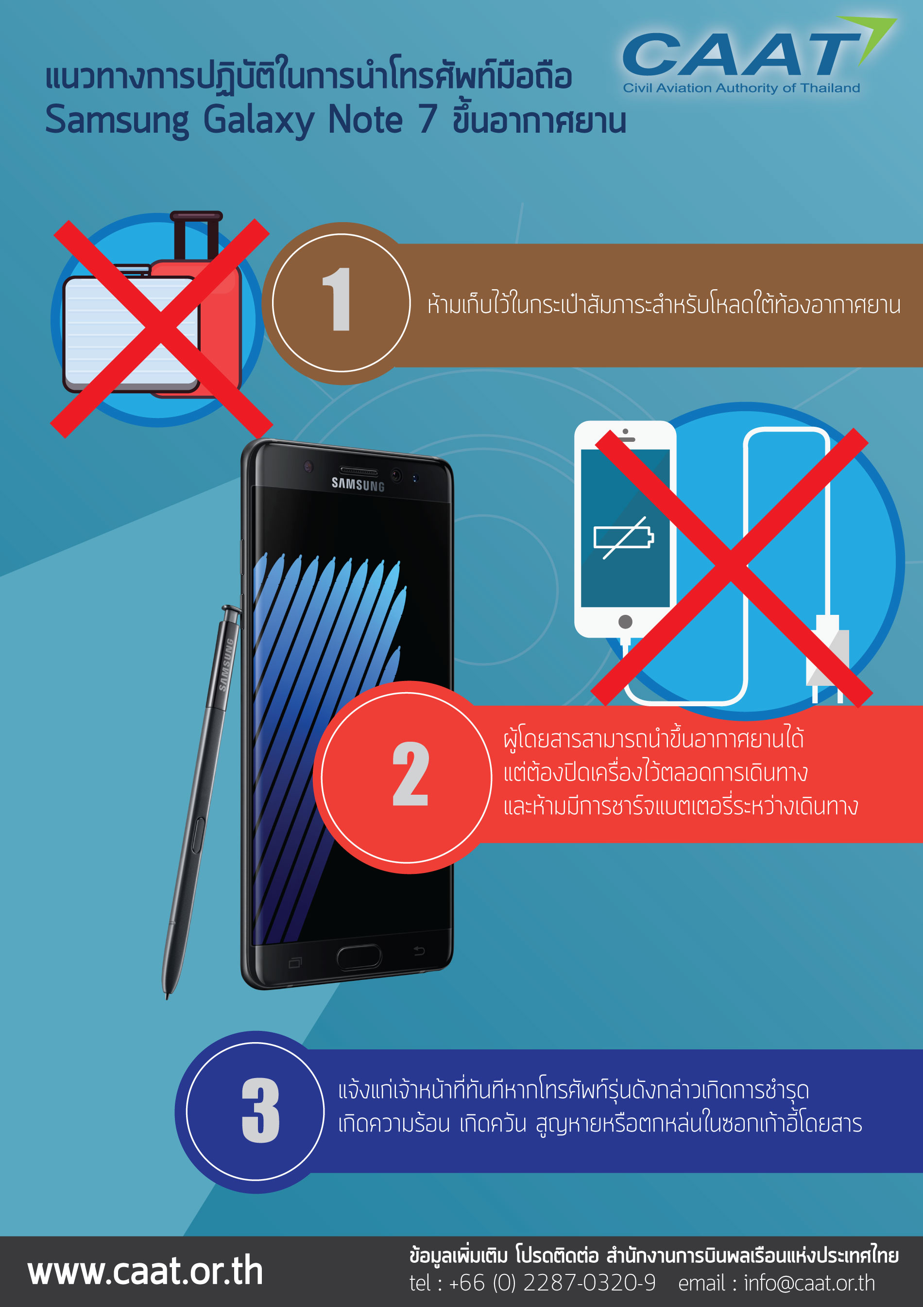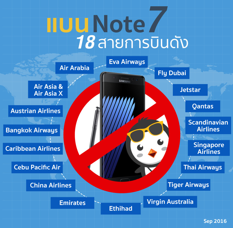 บริษัทผลิตโทรศัพท์เมืองโอปป้าค่ายดังของโลกถึงกับซวยหนักมาก เมื่อหลังจากที่ปล่อยสมาร์ทโฟนรุ่นใหม่ในนาม SAMSUNG GALAXY NOTE 7 แต่โทรศัพท์เจ้ากรรมก็ดันเกิดระเบิดตู้มขึ้นมาเป็นข่าวใหญ่โต ซึ่งบริษัทก็ออกมาเรียกคืนสินค้าทั้งหมดกว่า 2 ล้านเครื่อง และชะลอการส่งสินค้าให้กับผู้ที่จองไว้ออกไปอย่างไม่มีกำหนด (ประเทศไทยก็เช่นกัน) แต่เรื่องมันไม่จบแค่นั้นน่ะสิ เพราะหลังจากเกิดเหตุระเบิดจากโทรศัพท์ของคนที่ยังไม่ได้คืนเครื่องรวมกว่า 35 ครั้ง! ทำให้ตอนนี้สายการบินชั้นนำก็ออกมาแบนเจ้า NOTE 7 ไปอีก เพราะถ้าเกิดเหตุบึ้มบั้มขึ้นมาขณะบินอยู่คงไม่ดีเป็นแน่ แต่ก็ไม่ใช่ห้ามนำโทรศัพท์ขึ้นเครื่องเลยนะฮะ เพียงแค่งดใช้โทรศัพท์ (ห้ามเปิดเครื่องหรือใช้งานใดๆ ก็ตาม) งดชาร์จโทรศัพท์บนเครื่อง รวมถึงห้ามโหลดไว้กับสัมภาระใต้เครื่องบินด้วย