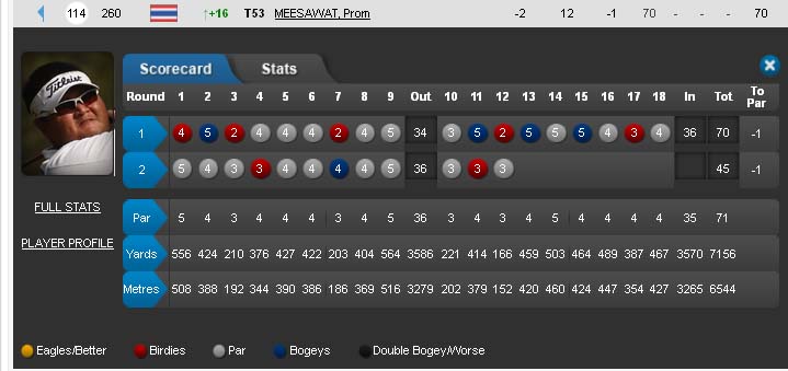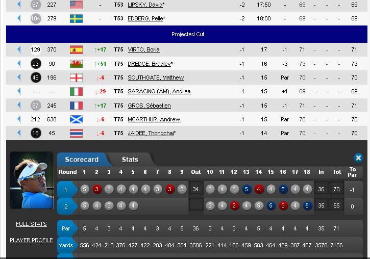 ส่วนสกอร์ของโปรช้าง ค่อนข้างเสียวอยู่ อยู่ที่ -1 เขาตัดตัวกันที่ -2 ครับ วันนี้ยังต้องลุ้นให้ผ่านการตัดตัวครับ