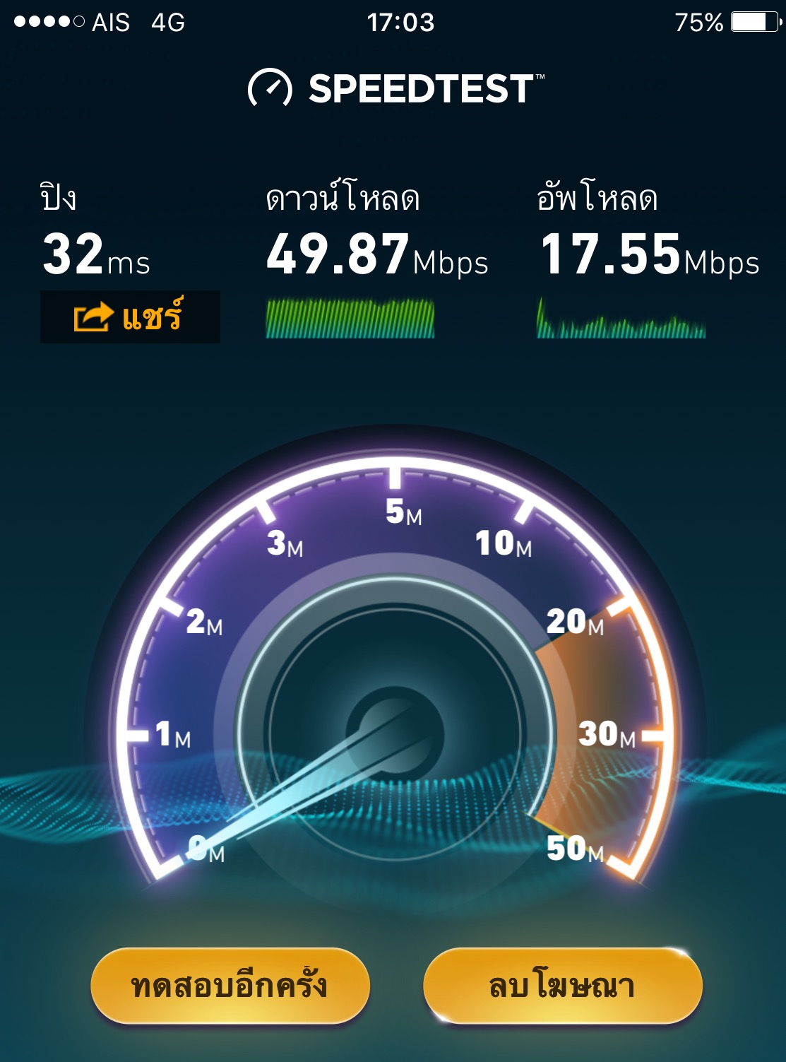 วันนี้ที่แก้ไขแล้วปกติจะได้แค่ 15-20 Mbps ตอนนี้ได้มากขึ้นเท่านี้ครับ