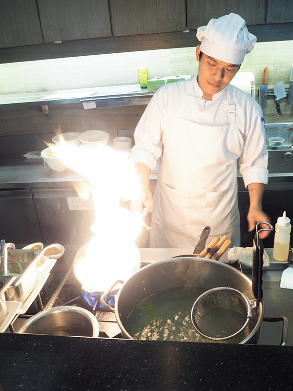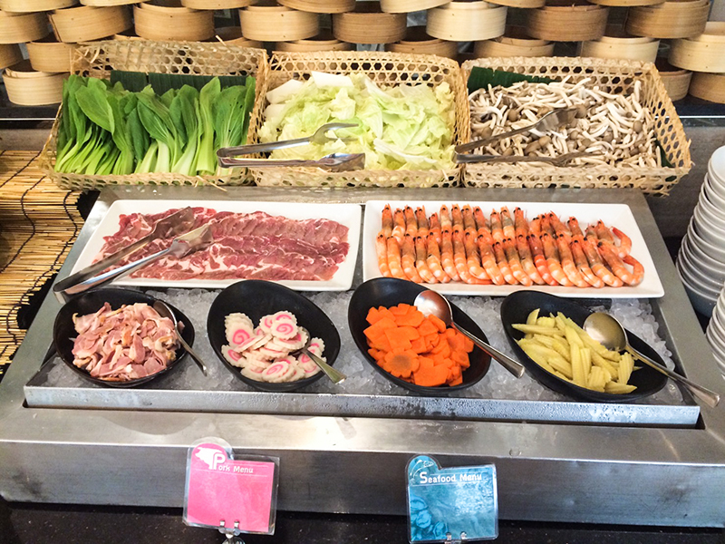 ไฮไลท์ของห้องอาหารแห่งนี้คือ Live Cooking Station ที่เราสามารถเลือกวัตถุดิบที่มีอยู่ มาให้เชฟทำเป็นเมนูแบบที่ทำสดๆ ใหม่ๆ ได้เลย อย่างเซตนี้คือสำหรับทำชาบู เครื่องเยอะใช้ได้