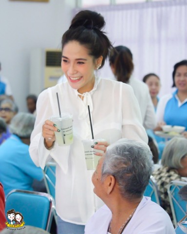 วันงาน พอถึงช่วงรับประทานอาหาร ทุกคนก็ช่วยกันนำอาหารและเครื่องดื่มไปเสิร์ฟให้คุณตาคุณยายพร้อมพูดคุยกับพวกท่าน