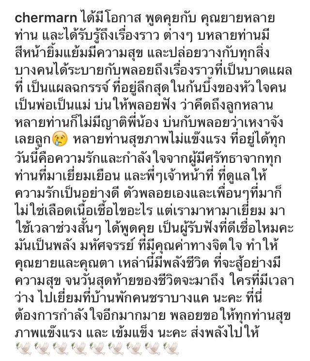 ขอฝากแคปชั่นน่ารักๆ จากไอจีพี่พลอยมาให้อ่าน เผื่อใครมีเวลา ก็แวะไปเยี่ยม พูดคุยเป็นเพื่อนคุณตาคุณยายกันได้นะคะ รับรองว่านอกจากจะได้มอบความสุขให้พวกท่านแล้ว เราเองก็จะได้รับความสุขและกำลังใจดีๆ กลับมาเช่นกันค่ะ