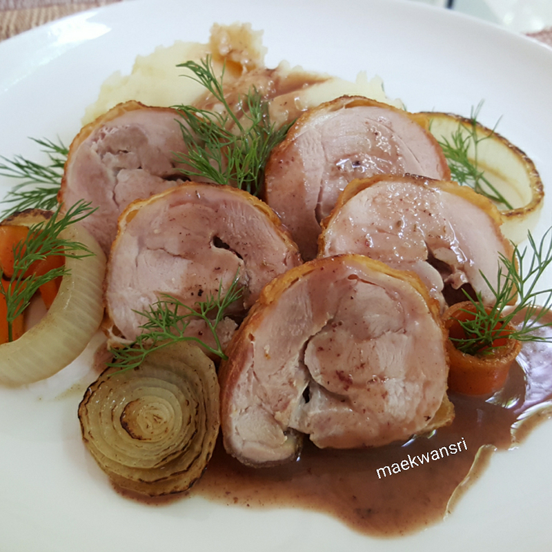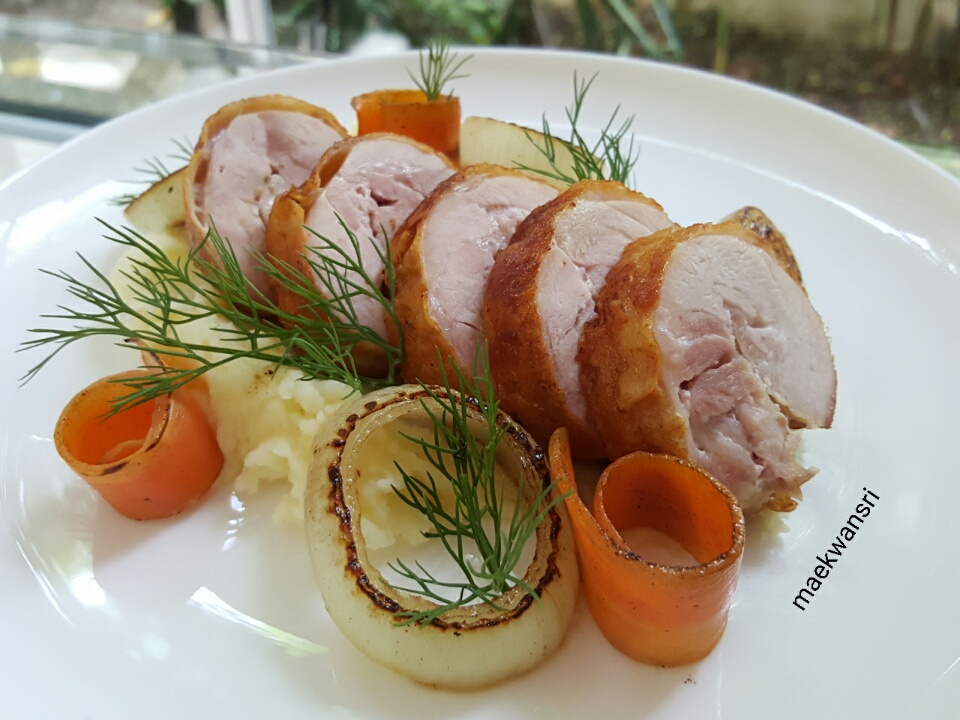 6.จัดจานหั่นไก่เป็นชิ้นวางหอมใหญ่แครอท ราดน้ำซอสลงไปเสริฟพร้อมมันฝรั่งบด.. อร่อยเลิศ