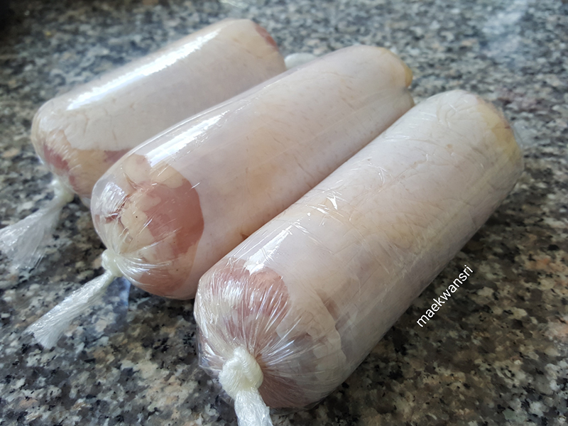 1.นำสะโพกไก่มาม้วนลงบนแรปอาหารผูกหัวท้ายให้แน่น