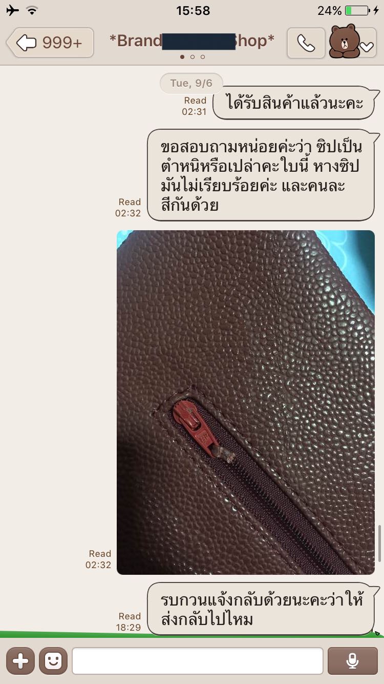 - วันศุกร์ 19:56น. ได้ข้อสรุปว่า ทางร้านให้ส่งกระเป๋าคืน แล้วจะเปลี่ยนใบใหม่มาให้ เราแจ้งว่าจะส่งคืนไปให้ในวันจันทร์เนื่องจากเกรงว่าจะติดเสาร์อาทิตย์แล้วสินค้าตกค้าง อาจหายได้ และแจ้งความประสงค์ไปว่า ขอสินค้าคุณภาพตามรูปที่ส่งมาให้ตอนเราเลือกซื้อนะคะ ใบที่รับมา คุณภาพแตกต่างกันอย่างเห็นได้ชัดเจน ทั้งตะเข็บ ฝีเข็มและคุณภาพหนังที่อ้างว่าเป็นหนังแท้ ตะเข็บห่าง ฝีเข็มไม่ถี่เท่าในรูป และหนังบุบ ยุบตามช่องค่ะ