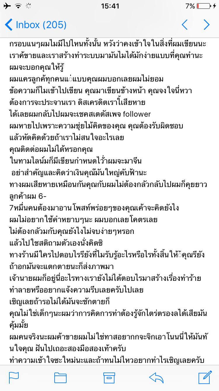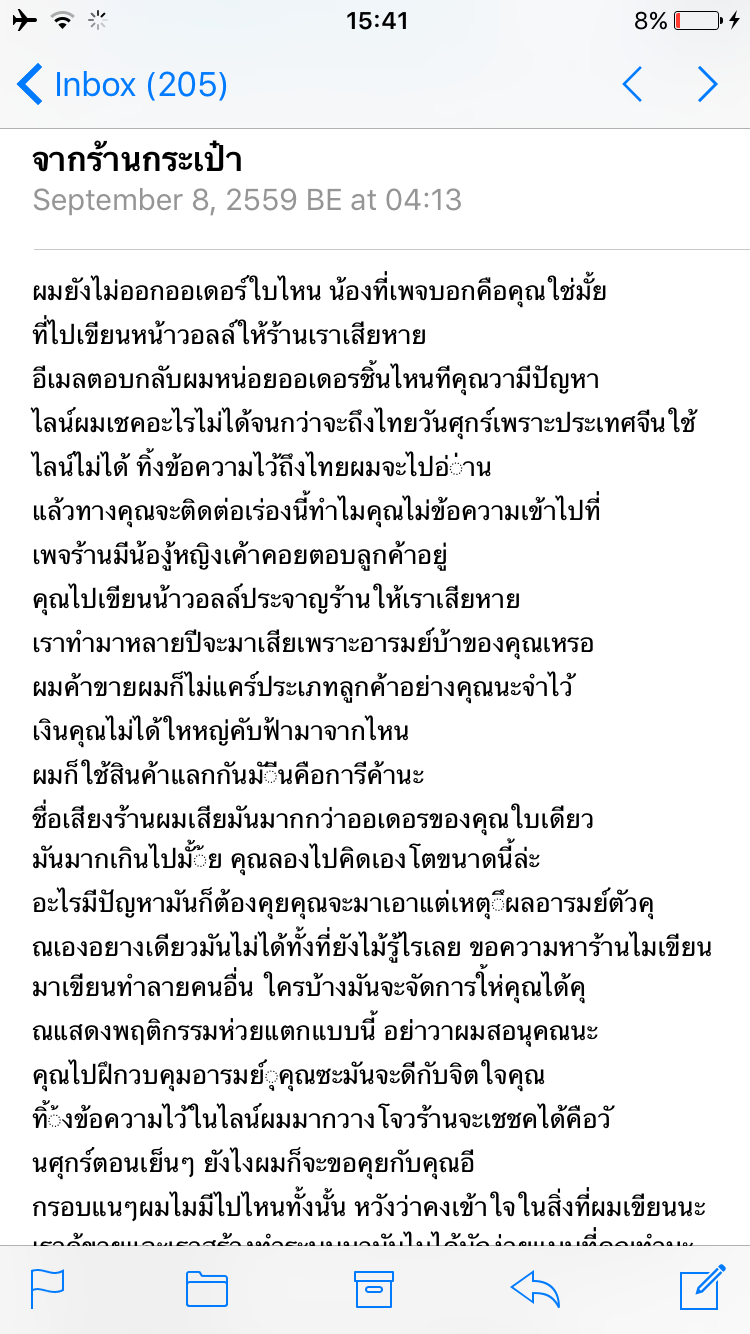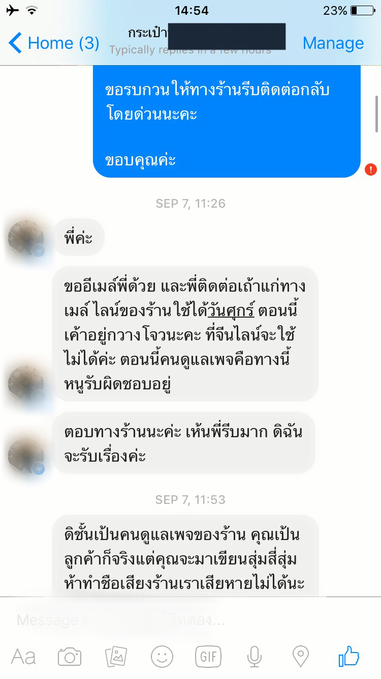 - เราตอบกลับในส่วนที่ร้านตำหนิเราและแจ้งอีเมลล์เราไป ตอน 13:08น. และหลังจากนี้ก็มีแต่การโต้เถียงกันค่ะ ทั้งจากในเพจและอีเมลล์ที่ให้ส่งไปหาเถ้าแก่ ข้อความไม่น่ารักทั้งนั้นค่ะ หลักฐานการคุยครบถ้วน แบบไม่ตัด อยู่ใน Spoil นะคะ