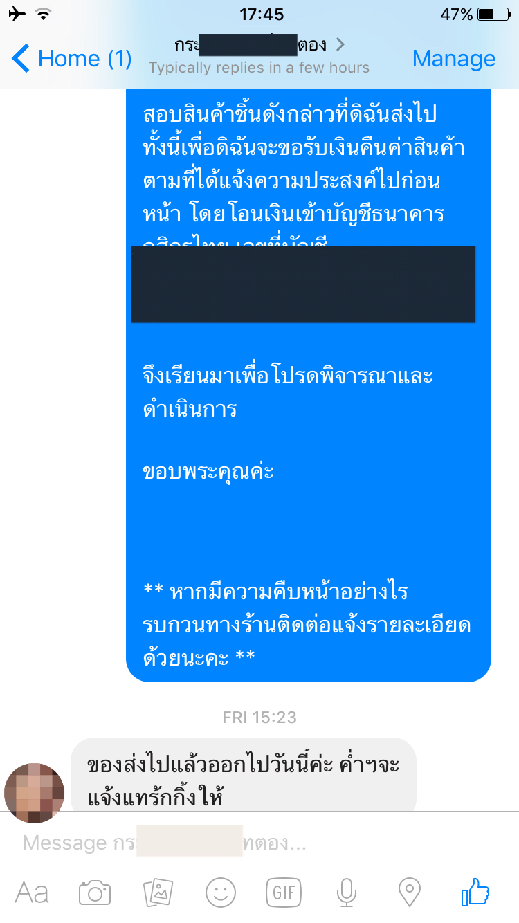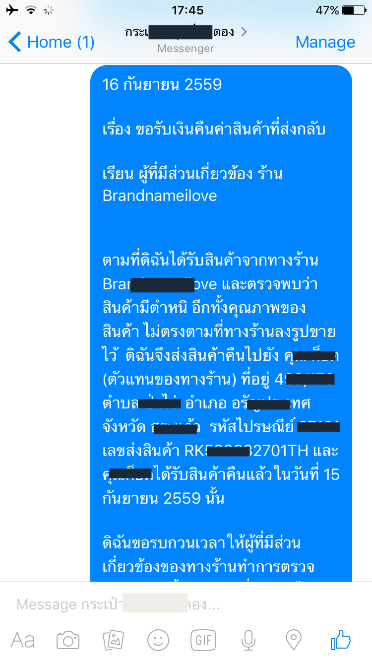 - วันพุธส่งไปบอกร้านว่า ส่งคืนไปแล้ว แต่ขอไม่รับสินค้าแล้วนะคะ เนื่องจากคิดว่า ใบใหม่มา ก็คุณภาพเช่นเดิม ถ้าร้านได้รับแล้ว รบกวนตรวจสอบสินค้าแล้วโอนเงินคืนค่ะ (ตั้งแต่ขอเบอร์ไปวันจันทร์ ก็ยังไม่อ่านค่ะ)