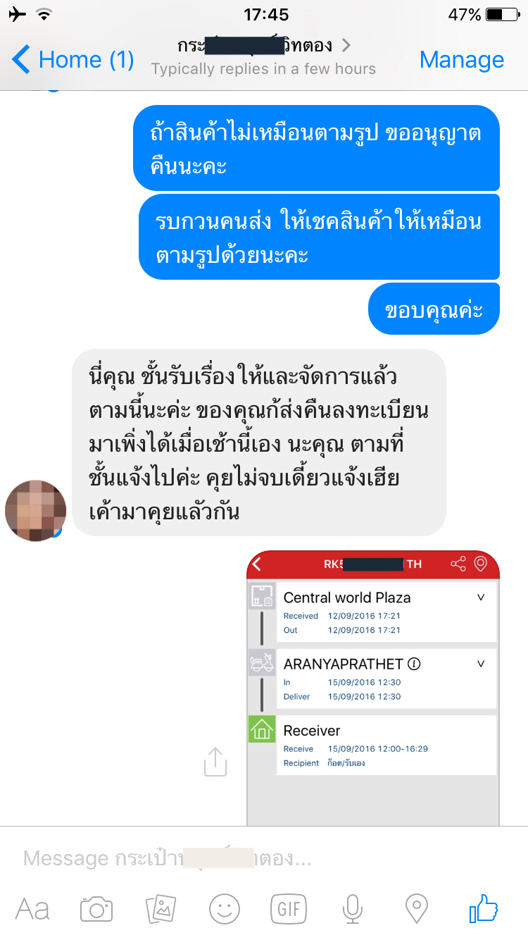 - วันศุกร์ 15:23น. ร้านส่งมาบอกว่า ส่งสินค้ามาให้แล้ว แล้วค่ำๆจะเอาเลขแทรคให้ ระหว่างนี้มีการโต้เถียงกันเล็กน้อย ตำหนิที่เราส่งกลับไปแบบลงทะเบียน (ตอนส่ง ร้านส่ง EMS มา แต่ใช้เวลา 4 วันเท่ากันกับที่เราส่งลงทะเบียนกลับไป เราบอกว่าแจ้งไว้แล้วว่าขอไม่รับสินค้า แต่ไม่เป็นไร ถ้าส่งมาแล้วสินค้าไม่เหมือนรูป ก็ค่อยขออนุญาตคืนนะคะ รบกวนคนส่งเช็คคุณภาพให้เหมือนรูปด้วย เพราะเราตัดสินใจซื้อสินค้าจากรูปนั้นที่ร้านบอกว่าเป็นสินค้าจริงที่จะได้รับ