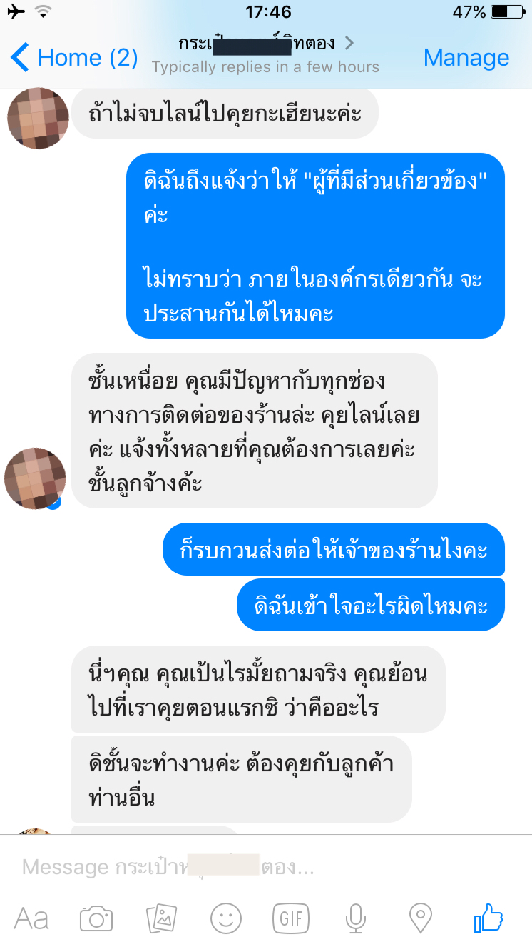 - พอเห็นว่าข้อความที่ส่งไป ขึ้นว่าอ่านแล้ว แต่เราไม่ได้รับการตอบกลับ เราเลยคอมเมนท์ในรูปภาพบนเพจของทางร้านว่า