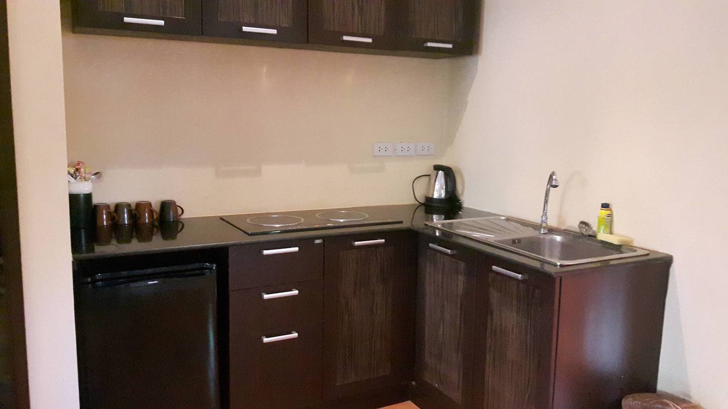 มีชากาแฟฟรีค่ะ มีกาน้ำร้อน แล้วเตาไว้ทำอาหารได้ค่ะ แต่ที่นี่อนุญาตให้ทำได้แค่อาหารที่กลิ่นไม่แรงค่ะ
