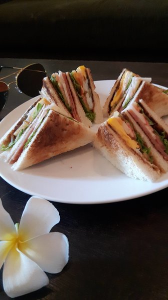 จานนี้เป็นแซนวิชของที่นี่ค่ะ มีอาหารหลายอย่างค่ะ มาส่งถึงห้องพักเลย