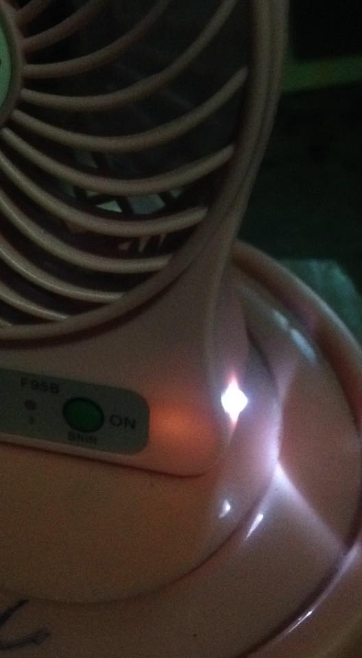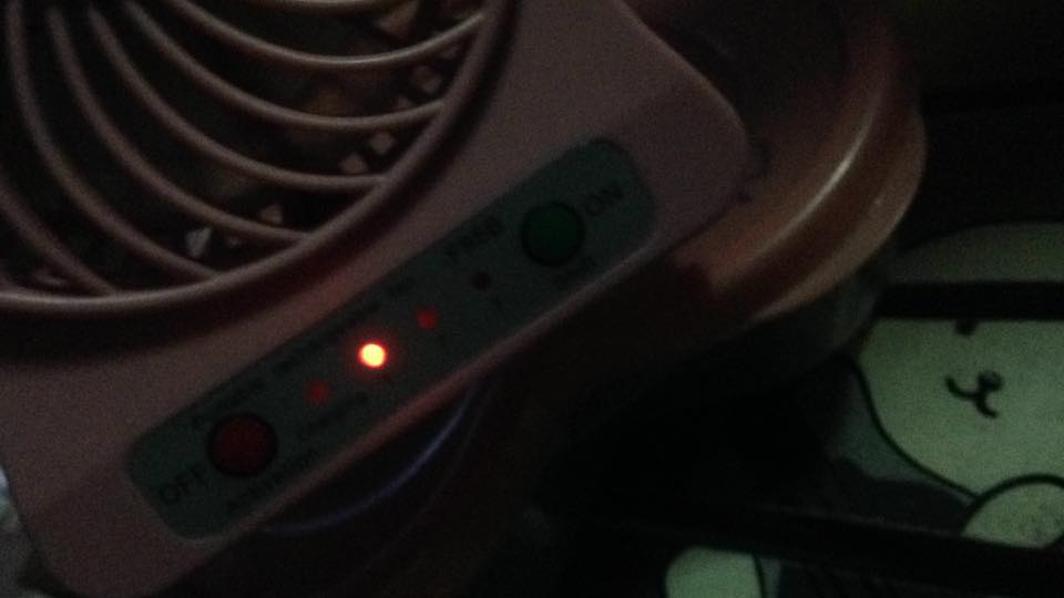 เพราะตอนนั้นเราชาร์จแท็บเล็ตอยู่ แล้วก็ลืมมานึกได้สายๆวันนี้เลยเอาพัดลมไปชาร์จตั้งแต่11โมงยันบ่าย4โมงเราก็นึกว่าไฟมันคงเต็มแล้ว เลยถอดเอามาเปิดดู ไฟมันติดใบพัดมันเหมือนจะหมุนแต่ไม่หมุนแค่สะบัดๆแล้วใบพัดมันก็ไม่พัด แต่ไฟติด เราเลยเอามาชาร์จกับสายอีกเส้นดูเพราะสายแรกรู้สึกว่า