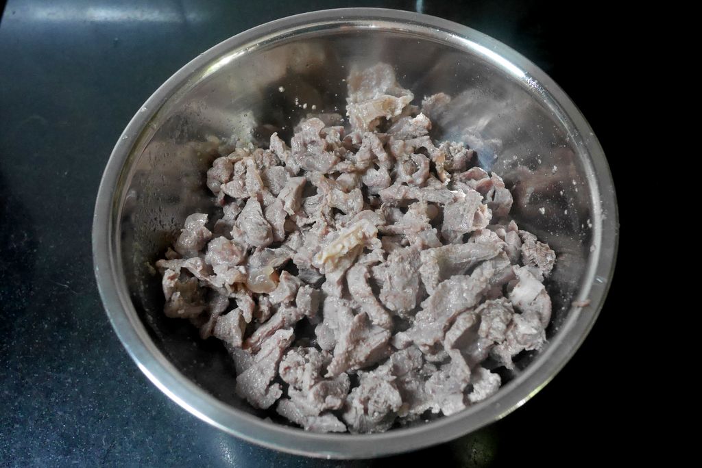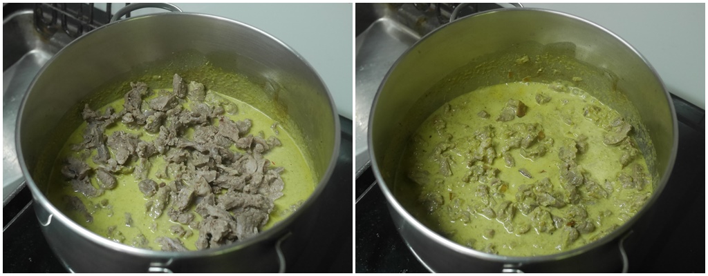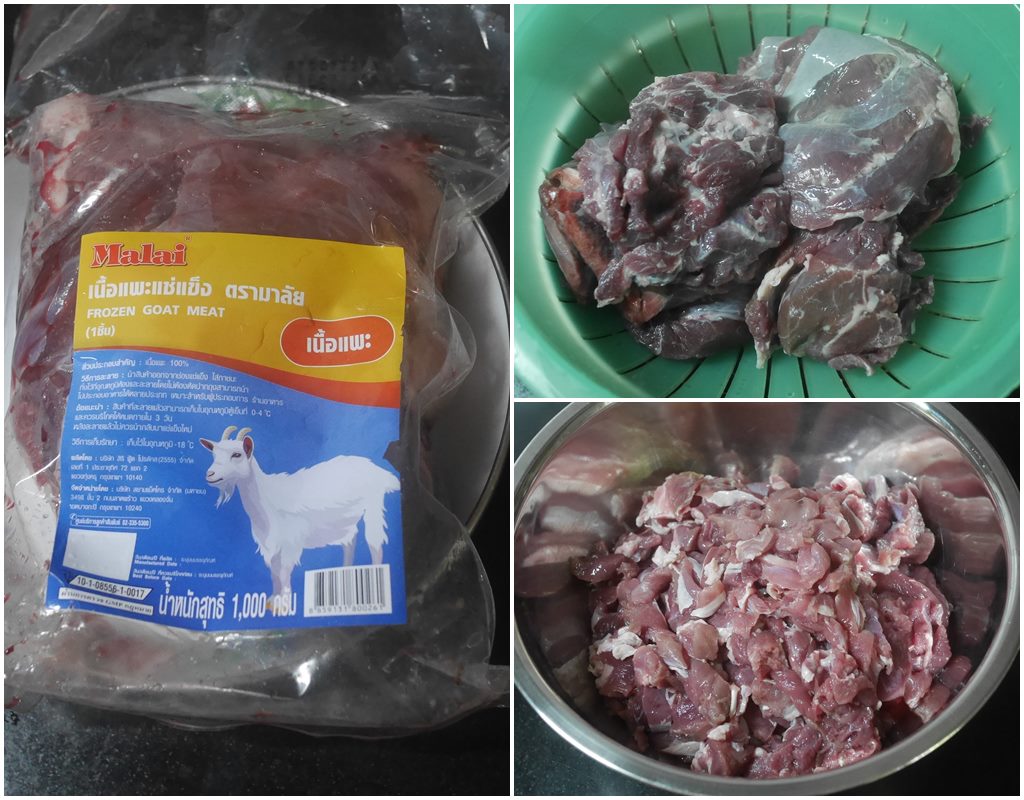 เนื้อแพะแช่แข็ง ไม่มีกลิ่นสาบ มีขายที่ห้างแมคโคร สาขาถนนนราธิวาสฯ ราคา 650 บาท/กก. (แพงดี) นำมาหั่นเป็นชิ้นเล็กและนำไปต้มกับหางกะทิประมาณ 40 นาทีจนเนื้อเปื่อย
