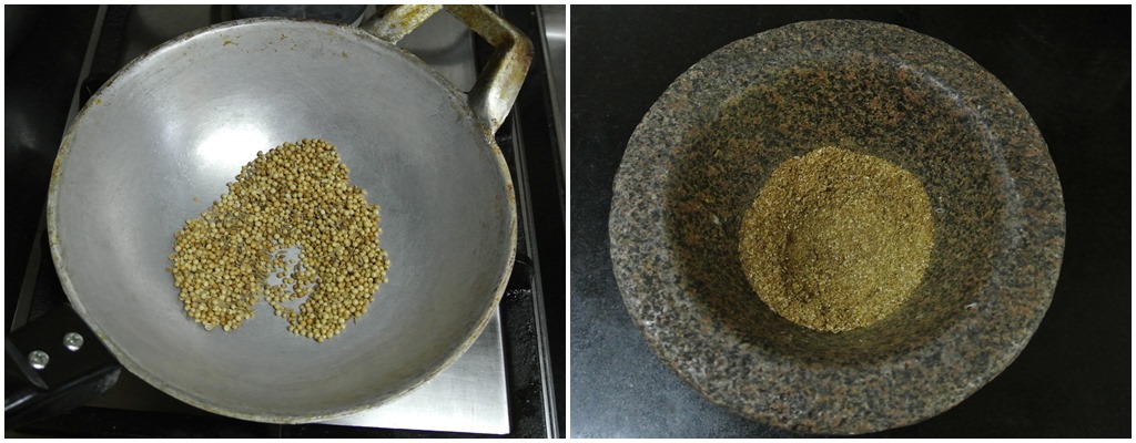 นำลูกผักชี 2 ช้อนชา และ ยี่หร่า 1 ช้อนชา ไปคั่วให้หอมและตำให้ละเอียด