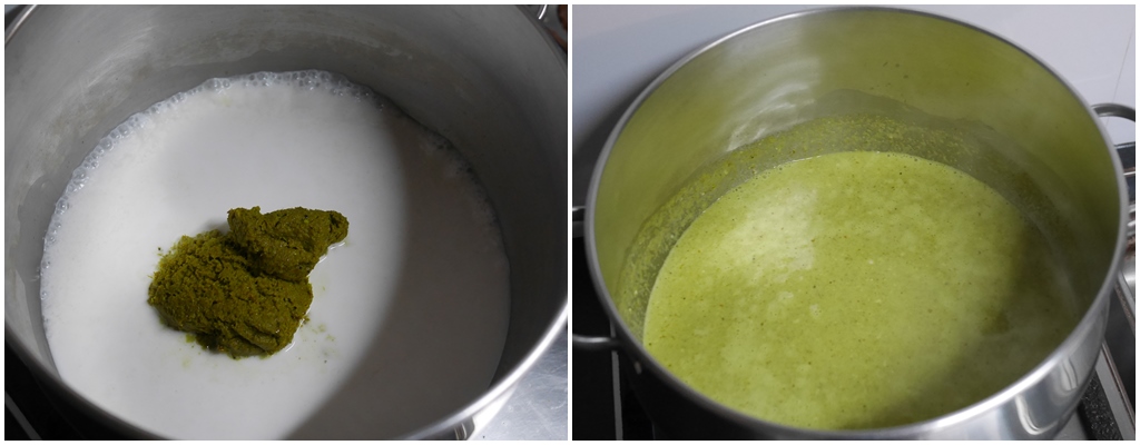 นำพริกแกงเขียวหวาน 1 ขีดพร้อมลูกผักชียี่หร่าป่น ลงไปผัดกับหัวกะทิครึ่งแรก ให้หอม